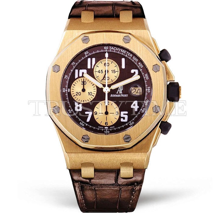 Часы Audemars Piguet из коллекции Royal Oak Offshore Chronograph. Спортивные мужские часы Audemars Piguet Royal Oak Offshore Arnold Schwarzenegger 26007BA.OO.D088CR.01 премиального качества (Артикул магазина: AP-0458) оснащены надежным автоматическим механизмом с автоподзаводом (работает от амплитуды движения руки) калибра AP3126, в котором реализованы следующие функции: часовая, минутная и секундная стрелки, а так же хронограф, дата. Восьмиугольный корпус часов цветы желтой золота, имеющий размер 42 мм и высоту 14.8 мм превосходно дополнит образ и украсит запястье своего обладателя. Для изготовления часов Audemars Piguet Royal Oak Offshore Arnold Schwarzenegger 26007BA.OO.D088CR.01 предлагаемых в нашем интернет-магазине, применяются нержавеющая сталь 316F высокого качества (Швейцарский стандарт), а так же сапфировое стекло высокой прочности, благодаря чему обеспечивается максимальная защита от сколов и механических повреждений. Отличительной чертой данной модели является коричневый циферблат, часовые индексы которого обеспечивают арабские цифры. Завершает образ кожаный ремешок коричневого цвета с фирменной классической застежкой Audemars Piguet. Водонепроницаемость данной модели составляет 30М (WR30) – допускается минимальное воздействие с водой.