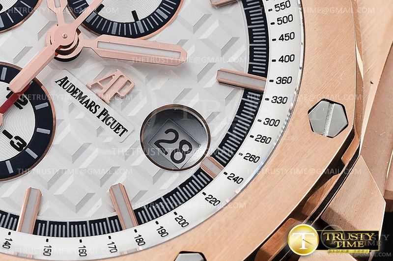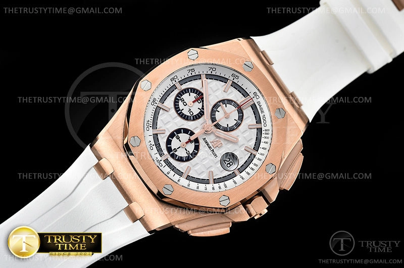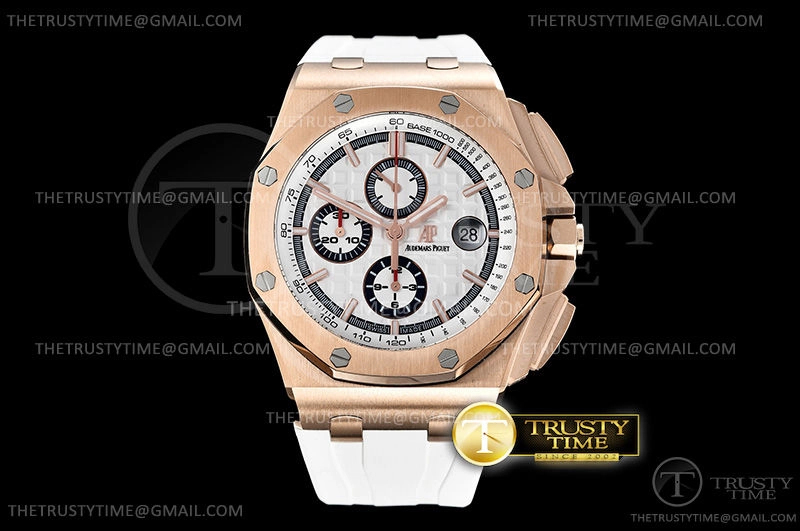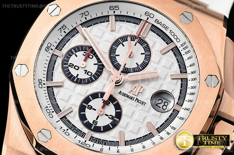 Часы Audemars Piguet из коллекции Royal Oak Offshore Chronograph. Спортивные мужские часы Audemars Piguet Royal Oak Offshore Chronograph Byblos Summer 2017 26408OR.OO.A010CA.01 премиального качества (Артикул магазина: AP-0849) оснащены надежным автоматическим механизмом с автоподзаводом (работает от амплитуды движения руки) калибра AP3126, в котором реализованы следующие функции: часовая, минутная и секундная стрелки, а так же хронограф, дата. Восьмиугольный корпус часов розового цвета, имеющий размер 44 мм и высоту 16 мм превосходно дополнит образ и украсит запястье своего обладателя. Для изготовления часов Audemars Piguet Royal Oak Offshore Chronograph Byblos Summer 2017 26408OR.OO.A010CA.01 предлагаемых в нашем интернет-магазине, применяются нержавеющая сталь 316L высокого качества (Швейцарский стандарт), а так же сапфировое стекло высокой прочности, благодаря чему обеспечивается максимальная защита от сколов и механических повреждений. Отличительной чертой данной модели является белый циферблат, часовые индексы которого обеспечивают часовые метки. Завершает образ каучуковый ремешок белого цвета с фирменной классической застежкой Audemars Piguet. Водонепроницаемость данной модели составляет 30М (WR30) – допускается минимальное воздействие с водой.