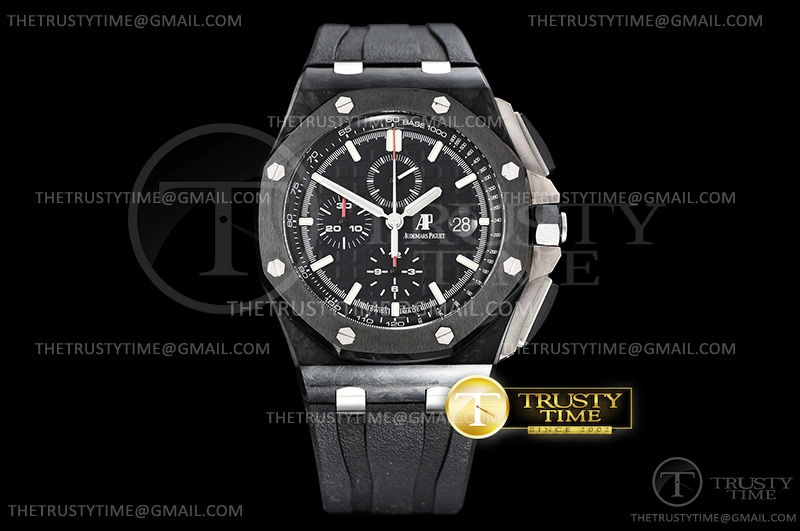 Часы Audemars Piguet из коллекции Royal Oak Offshore Chronograph. Спортивные мужские часы Audemars Piguet Royal Oak Offshore Chronograph 26400AU.OO.A002CA.01 премиального качества (Артикул магазина: AP-0842) оснащены надежным автоматическим механизмом с автоподзаводом (работает от амплитуды движения руки) калибра AP3126, в котором реализованы следующие функции: часовая, минутная и секундная стрелки, а так же хронограф, дата. Восьмиугольный корпус часов черного цвета, имеющий размер 44 мм и высоту 16 мм превосходно дополнит образ и украсит запястье своего обладателя. Для изготовления часов Audemars Piguet Royal Oak Offshore Chronograph 26400AU.OO.A002CA.01 предлагаемых в нашем интернет-магазине, применяются кованый карбон высокого качества (Швейцарский стандарт), а так же сапфировое стекло высокой прочности, благодаря чему обеспечивается максимальная защита от сколов и механических повреждений. Отличительной чертой данной модели является черный циферблат, часовые индексы которого обеспечивают часовые метки. Завершает образ каучуковый ремешок черного цвета с фирменной классической застежкой Audemars Piguet. Водонепроницаемость данной модели составляет 30М (WR30) – допускается минимальное воздействие с водой.