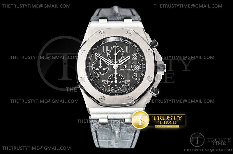 Часы Audemars Piguet из коллекции Royal Oak Offshore Chronograph. Спортивные мужские часы Audemars Piguet Royal Oak Offshore Chronograph 26470ST.OO.A104CR.01 премиального качества (Артикул магазина: AP-0837) оснащены надежным автоматическим механизмом с автоподзаводом (работает от амплитуды движения руки) калибра AP3126, в котором реализованы следующие функции: часовая, минутная и секундная стрелки, а так же хронограф, дата. Восьмиугольный корпус часов стального цвета, имеющий размер 42 мм и высоту 16 мм превосходно дополнит образ и украсит запястье своего обладателя. Для изготовления часов Audemars Piguet Royal Oak Offshore Chronograph 26470ST.OO.A104CR.01 предлагаемых в нашем интернет-магазине, применяются нержавеющая сталь 316F высокого качества (Швейцарский стандарт), а так же сапфировое стекло высокой прочности, благодаря чему обеспечивается максимальная защита от сколов и механических повреждений. Отличительной чертой данной модели является серый циферблат, часовые индексы которого обеспечивают арабские цифры. Завершает образ кожаный ремешок серого цвета с фирменной классической застежкой Audemars Piguet. Водонепроницаемость данной модели составляет 30М (WR30) – допускается минимальное воздействие с водой.