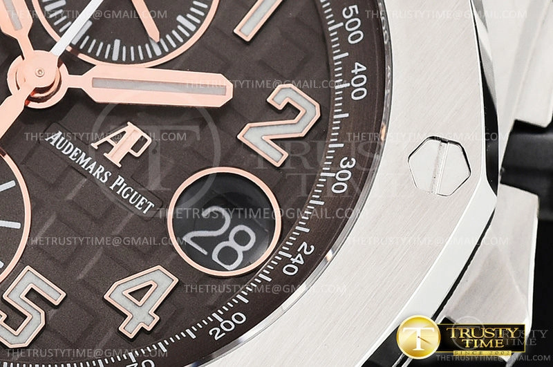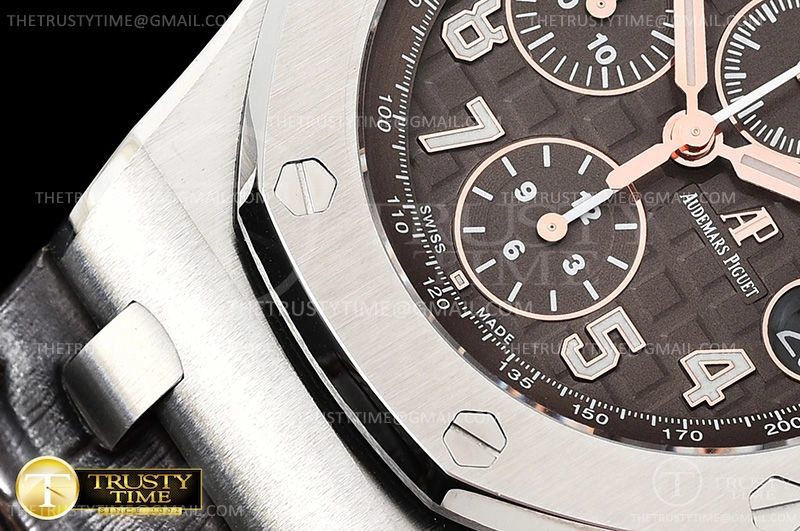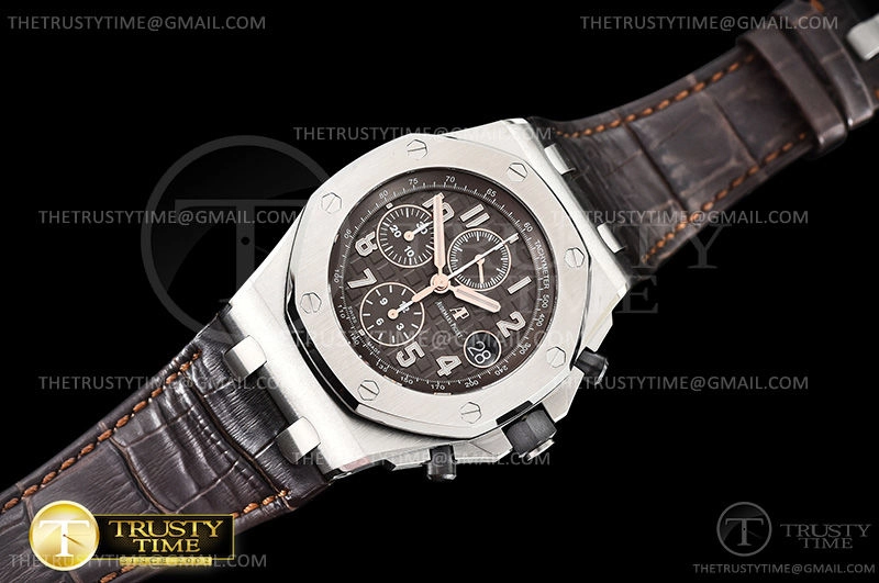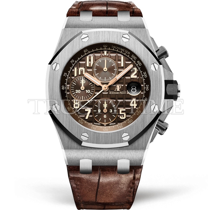 Часы Audemars Piguet из коллекции Royal Oak Offshore Chronograph. Спортивные мужские часы Audemars Piguet Royal Oak Offshore Chronograph Havana Brown SIHH 2018 26470ST.OO.A820CR.01 премиального качества (Артикул магазина: AP-0840) оснащены надежным автоматическим механизмом с автоподзаводом (работает от амплитуды движения руки) калибра AP3126, в котором реализованы следующие функции: часовая, минутная и секундная стрелки, а так же хронограф, дата. Восьмиугольный корпус часов стального цвета, имеющий размер 42 мм и высоту 16 мм превосходно дополнит образ и украсит запястье своего обладателя. Для изготовления часов Audemars Piguet Royal Oak Offshore Chronograph Havana Brown SIHH 2018 26470ST.OO.A820CR.01 предлагаемых в нашем интернет-магазине, применяются нержавеющая сталь 316F высокого качества (Швейцарский стандарт), а так же сапфировое стекло высокой прочности, благодаря чему обеспечивается максимальная защита от сколов и механических повреждений. Отличительной чертой данной модели является коричневый циферблат, часовые индексы которого обеспечивают арабские цифры. Завершает образ кожаный ремешок коричневого цвета с фирменной классической застежкой Audemars Piguet. Водонепроницаемость данной модели составляет 30М (WR30) – допускается минимальное воздействие с водой.