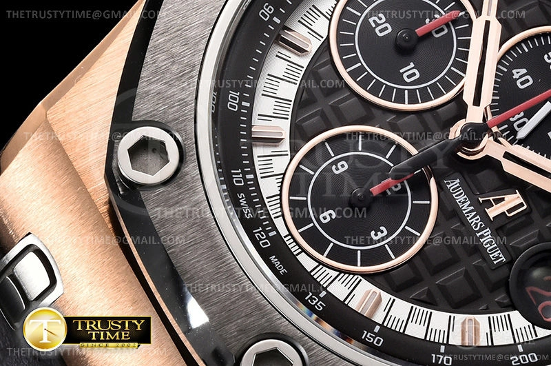 Часы Audemars Piguet из коллекции Royal Oak Offshore Chronograph Schumacher. Спортивные мужские часы Audemars Piguet Royal Oak Offshore Michael Schumacher 26568OM.OO.A004CA.01 премиального качества (Артикул магазина: AP-0881) оснащены надежным автоматическим механизмом с автоподзаводом (работает от амплитуды движения руки) калибра AP3126, в котором реализованы следующие функции: часовая, минутная и секундная стрелки, а так же хронограф, дата. Восьмиугольный корпус часов розового цвета, имеющий размер 44 мм и высоту 16 мм превосходно дополнит образ и украсит запястье своего обладателя. Для изготовления часов Audemars Piguet Royal Oak Offshore Michael Schumacher 26568OM.OO.A004CA.01 предлагаемых в нашем интернет-магазине, применяются нержавеющая сталь 316F высокого качества (Швейцарский стандарт), а так же сапфировое стекло высокой прочности, благодаря чему обеспечивается максимальная защита от сколов и механических повреждений. Отличительной чертой данной модели является серый циферблат, часовые индексы которого обеспечивают часовые метки. Завершает образ каучуковый ремешок черного цвета с фирменной классической застежкой Audemars Piguet. Водонепроницаемость данной модели составляет 30М (WR30) – допускается минимальное воздействие с водой.