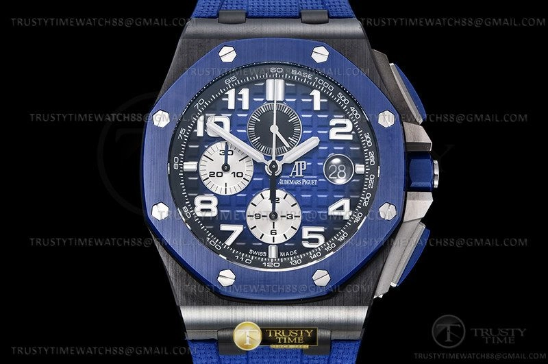 Часы Audemars Piguet из коллекции Royal Oak Offshore Chronograph. Спортивные мужские часы Audemars Piguet Royal Oak Offshore Chronograph 26405CE.OO.A030CA.01 премиального качества (Артикул магазина: AP-1027) оснащены надежным автоматическим механизмом с автоподзаводом (работает от амплитуды движения руки) калибра AP3126, в котором реализованы следующие функции: часовая, минутная и секундная стрелки, а так же хронограф, дата. Восьмиугольный корпус часов черного цвета, имеющий размер 44 мм и высоту 16 мм превосходно дополнит образ и украсит запястье своего обладателя. Для изготовления часов Audemars Piguet Royal Oak Offshore Chronograph 26405CE.OO.A030CA.01 предлагаемых в нашем интернет-магазине, применяются керамика высокого качества (Швейцарский стандарт), а так же сапфировое стекло высокой прочности, благодаря чему обеспечивается максимальная защита от сколов и механических повреждений. Отличительной чертой данной модели является синий циферблат, часовые индексы которого обеспечивают арабские цифры. Завершает образ каучуковый ремешок синего цвета с фирменной классической застежкой Audemars Piguet. Водонепроницаемость данной модели составляет 30М (WR30) – допускается минимальное воздействие с водой.