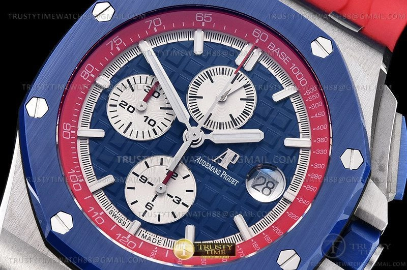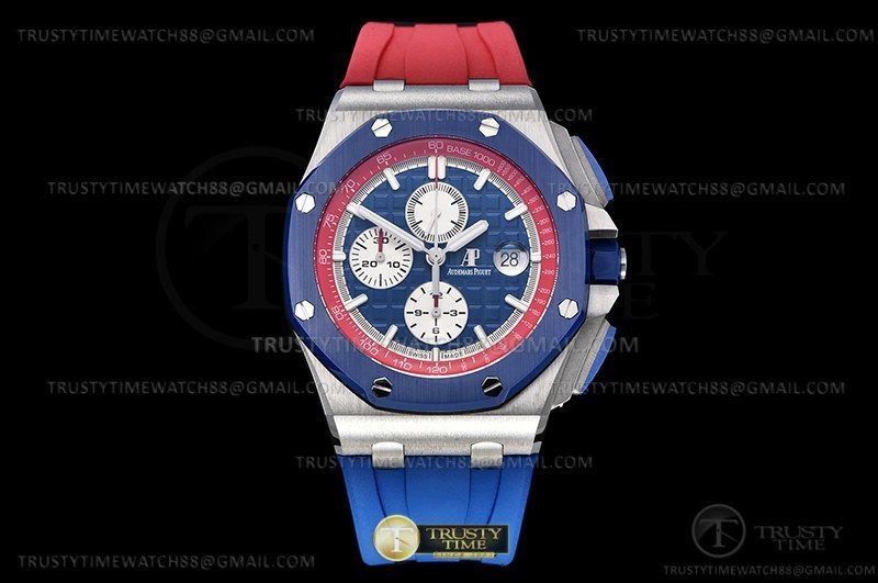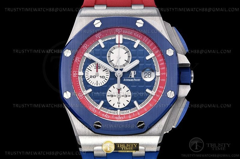 Часы Audemars Piguet из коллекции Royal Oak Offshore Chronograph. Спортивные мужские часы Audemars Piguet Royal Oak Offshore Ryder Cup USA 26400SO.OO.A502CA.01 премиального качества (Артикул магазина: AP-1049) оснащены надежным автоматическим механизмом с автоподзаводом (работает от амплитуды движения руки) калибра AP3126, в котором реализованы следующие функции: часовая, минутная и секундная стрелки, а так же хронограф, дата. Восьмиугольный корпус часов стального цвета, имеющий размер 44 мм и высоту 16 мм превосходно дополнит образ и украсит запястье своего обладателя. Для изготовления часов Audemars Piguet Royal Oak Offshore Ryder Cup USA 26400SO.OO.A502CA.01 предлагаемых в нашем интернет-магазине, применяются нержавеющая сталь 316F высокого качества (Швейцарский стандарт), а так же сапфировое стекло высокой прочности, благодаря чему обеспечивается максимальная защита от сколов и механических повреждений. Отличительной чертой данной модели является синий циферблат, часовые индексы которого обеспечивают часовые метки. Завершает образ каучуковый ремешок красного цвета с фирменной классической застежкой Audemars Piguet. Водонепроницаемость данной модели составляет 30М (WR30) – допускается минимальное воздействие с водой.