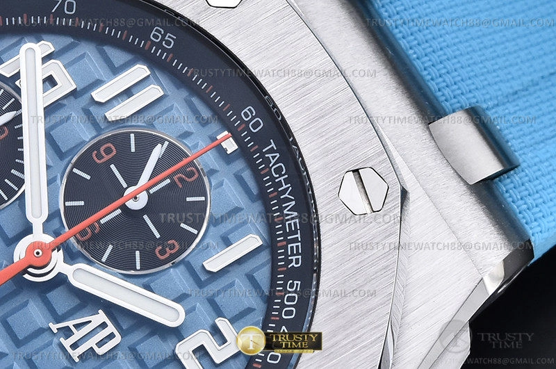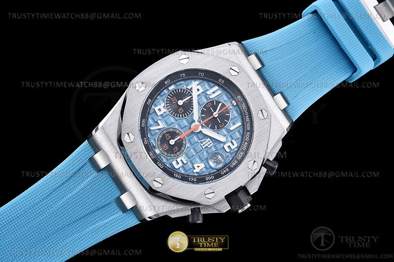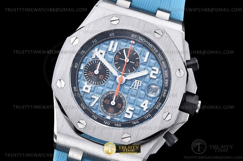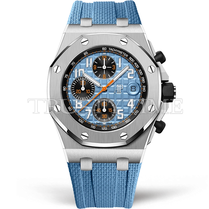 Часы Audemars Piguet из коллекции Royal Oak Offshore Chronograph. Спортивные мужские часы Audemars Piguet Royal Oak Offshore Selfwinding Chronograph 26238ST.OO.A340CA.01 премиального качества (Артикул магазина: AP-1097) оснащены надежным автоматическим механизмом с автоподзаводом (работает от амплитуды движения руки) калибра AP4404, в котором реализованы следующие функции: часовая, минутная и секундная стрелки, а так же хронограф, дата. Восьмиугольный корпус часов стального цвета, имеющий размер 42 мм и высоту 15 мм превосходно дополнит образ и украсит запястье своего обладателя. Для изготовления часов Audemars Piguet Royal Oak Offshore Selfwinding Chronograph 26238ST.OO.A340CA.01 предлагаемых в нашем интернет-магазине, применяются нержавеющая сталь 316L высокого качества (Швейцарский стандарт), а так же сапфировое стекло высокой прочности, благодаря чему обеспечивается максимальная защита от сколов и механических повреждений. Отличительной чертой данной модели является голубой циферблат, часовые индексы которого обеспечивают арабские цифры. Завершает образ каучуковый ремешок голубого цвета с фирменной классической застежкой Audemars Piguet. Водонепроницаемость данной модели составляет 30М (WR30) – допускается минимальное воздействие с водой.
