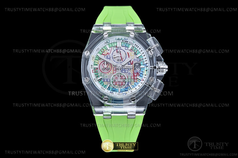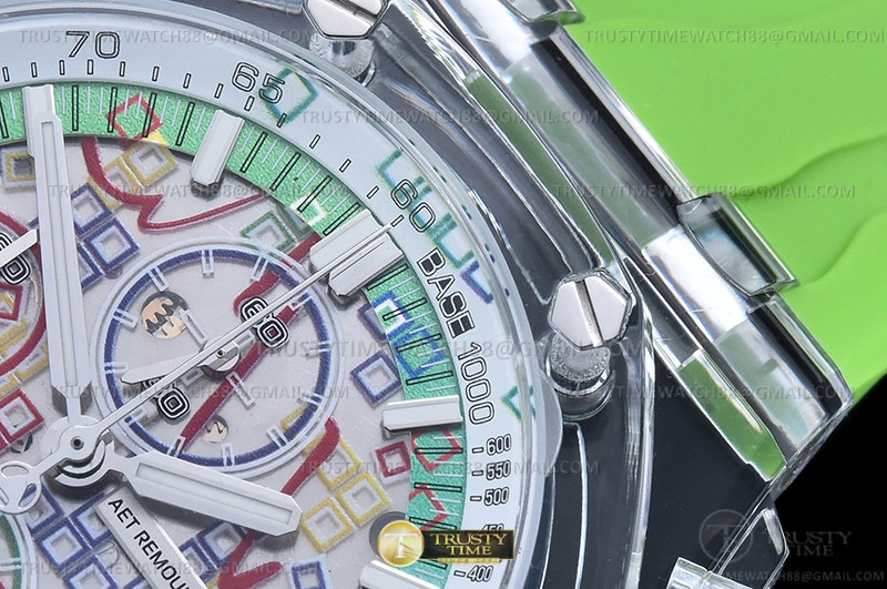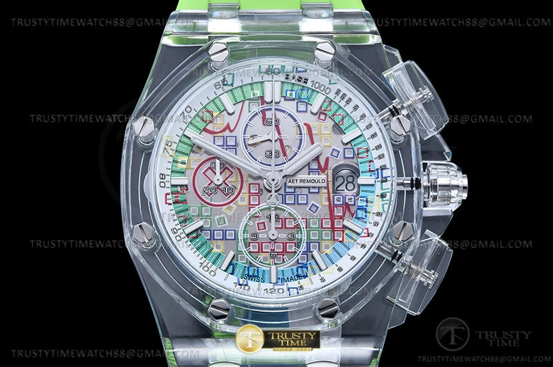 Часы Audemars Piguet из коллекции Royal Oak Offshore Chronograph. Спортивные мужские часы Audemars Piguet Royal Oak Offshore Chronograph AET Remould Sapphire GRID GAME премиального качества (Артикул магазина: AP-1125) оснащены надежным автоматическим механизмом с автоподзаводом (работает от амплитуды движения руки) калибра AP3126, в котором реализованы следующие функции: часовая, минутная и секундная стрелки, а так же хронограф, дата. Восьмиугольный корпус часов прозрачного цвета, имеющий размер 44 мм и высоту 17 мм превосходно дополнит образ и украсит запястье своего обладателя. Для изготовления часов Audemars Piguet Royal Oak Offshore Chronograph AET Remould Sapphire GRID GAME предлагаемых в нашем интернет-магазине, применяются композитный материал высокого качества (Швейцарский стандарт), а так же сапфировое стекло высокой прочности, благодаря чему обеспечивается максимальная защита от сколов и механических повреждений. Отличительной чертой данной модели является серебристый циферблат, часовые индексы которого обеспечивают часовые метки. Завершает образ каучуковый ремешок зеленого цвета с фирменной раскладывающейся застежкой Audemars Piguet. Водонепроницаемость данной модели составляет 30М (WR30) – допускается минимальное воздействие с водой.