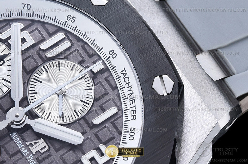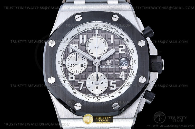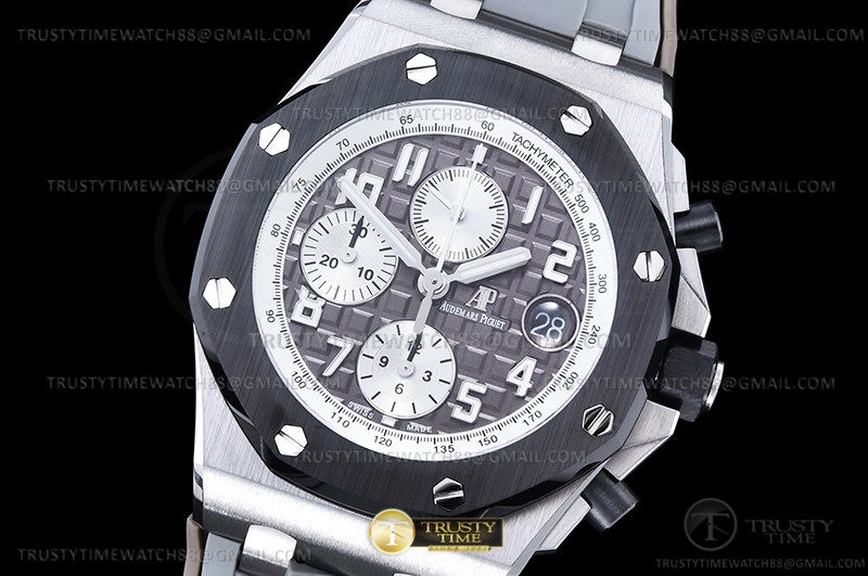 Часы Audemars Piguet из коллекции Royal Oak Offshore Chronograph. Спортивные мужские часы Audemars Piguet Royal Oak Offshore Chronograph 26470IO.OO.A006CA.01.A премиального качества (Артикул магазина: AP-1137) оснащены надежным автоматическим механизмом с автоподзаводом (работает от амплитуды движения руки) калибра AP3126, в котором реализованы следующие функции: часовая, минутная и секундная стрелки, а так же хронограф, дата. Восьмиугольный корпус часов стального цвета, имеющий размер 42 мм и высоту 17 мм превосходно дополнит образ и украсит запястье своего обладателя. Для изготовления часов Audemars Piguet Royal Oak Offshore Chronograph 26470IO.OO.A006CA.01.A предлагаемых в нашем интернет-магазине, применяются нержавеющая сталь 316F высокого качества (Швейцарский стандарт), а так же сапфировое стекло высокой прочности, благодаря чему обеспечивается максимальная защита от сколов и механических повреждений. Отличительной чертой данной модели является серый циферблат, часовые индексы которого обеспечивают арабские цифры. Завершает образ каучуковый ремешок серого цвета с фирменной классической застежкой Audemars Piguet. Водонепроницаемость данной модели составляет 30М (WR30) – допускается минимальное воздействие с водой.