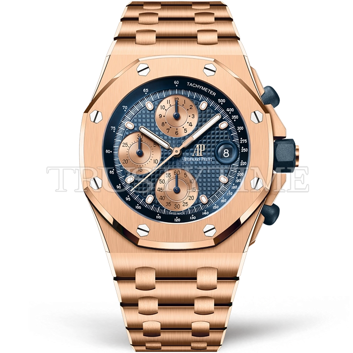 Часы Audemars Piguet из коллекции Royal Oak Offshore Chronograph. Спортивные мужские часы Audemars Piguet Royal Oak Offshore Chronograph 26238OR.OO.2000OR.01 премиального качества (Артикул магазина: AP-1120) оснащены надежным автоматическим механизмом с автоподзаводом (работает от амплитуды движения руки) калибра AP4404, в котором реализованы следующие функции: часовая, минутная и секундная стрелки, а так же хронограф, дата. Восьмиугольный корпус часов розового цвета, имеющий размер 42 мм и высоту 16 мм превосходно дополнит образ и украсит запястье своего обладателя. Для изготовления часов Audemars Piguet Royal Oak Offshore Chronograph 26238OR.OO.2000OR.01 предлагаемых в нашем интернет-магазине, применяются нержавеющая сталь 316F высокого качества (Швейцарский стандарт), а так же сапфировое стекло высокой прочности, благодаря чему обеспечивается максимальная защита от сколов и механических повреждений. Отличительной чертой данной модели является синий циферблат, часовые индексы которого обеспечивают часовые метки. Завершает образ браслет из нержавеющей стали цвета розового золота с фирменной раскладывающейся застежкой Audemars Piguet. Водонепроницаемость данной модели составляет 30М (WR30) – допускается минимальное воздействие с водой.