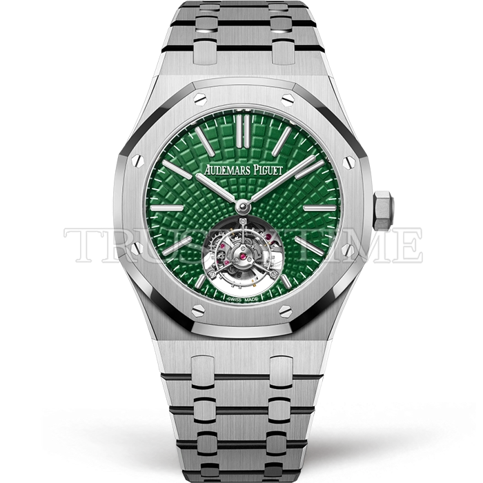 Часы Audemars Piguet из коллекции Royal Oak Tourbillon. Классические мужские часы Audemars Piguet Royal Oak Tourbillon Extra-Thin 26534TI.OO.1220TI.01 премиального качества (Артикул магазина: AP-0481) оснащены надежным автоматическим механизмом с ручным заводом калибра Seagull Handwind Tourbillon, в котором реализованы следующие функции: часова и минутка стрелки, а так же турбийон. Восьмиугольный корпус часов стального цвета, имеющий размер 41 мм и высоту 11.2 мм превосходно дополнит образ и украсит запястье своего обладателя. Для изготовления часов Audemars Piguet Royal Oak Tourbillon Extra-Thin 26534TI.OO.1220TI.01 предлагаемых в нашем интернет-магазине, применяются нержавеющая сталь 316L высокого качества (Швейцарский стандарт), а так же сапфировое стекло высокой прочности, благодаря чему обеспечивается максимальная защита от сколов и механических повреждений. Отличительной чертой данной модели является зеленый циферблат, часовые индексы которого обеспечивают часовые метки. Завершает образ браслет из нержавеющей стали стального цвета с фирменной раскладывающейся застежкой Audemars Piguet. Водонепроницаемость данной модели составляет 30М (WR30) – допускается минимальное воздействие с водой.