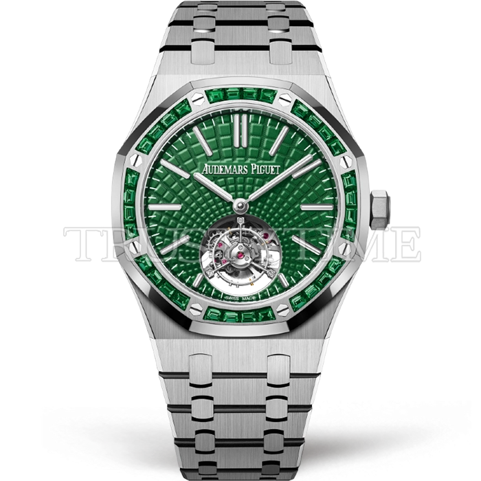 Часы Audemars Piguet из коллекции Royal Oak Tourbillon. Классические мужские часы Audemars Piguet Royal Oak Tourbillon Extra-Thin 26532IC.EE.1220TI.01 премиального качества (Артикул магазина: AP-1056) оснащены надежным автоматическим механизмом с автоподзаводом (работает от амплитуды движения руки) калибра AP2950, в котором реализованы следующие функции: часова и минутка стрелки, а так же турбийон. Восьмиугольный корпус часов стального цвета, имеющий размер 41 мм и высоту 11.2 мм превосходно дополнит образ и украсит запястье своего обладателя. Для изготовления часов Audemars Piguet Royal Oak Tourbillon Extra-Thin 26532IC.EE.1220TI.01 предлагаемых в нашем интернет-магазине, применяются нержавеющая сталь 316L высокого качества (Швейцарский стандарт), а так же сапфировое стекло высокой прочности, благодаря чему обеспечивается максимальная защита от сколов и механических повреждений. Отличительной чертой данной модели является зеленый циферблат, часовые индексы которого обеспечивают часовые метки. Завершает образ браслет из нержавеющей стали стального цвета с фирменной раскладывающейся застежкой Audemars Piguet. Водонепроницаемость данной модели составляет 30М (WR30) – допускается минимальное воздействие с водой.