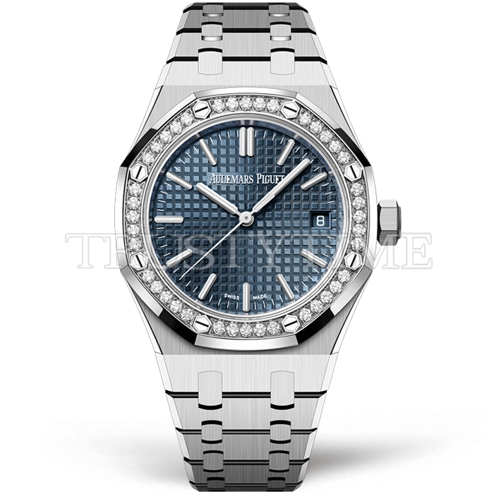 Часы Audemars Piguet из коллекции Royal Oak. Классические женские часы Audemars Piguet Royal Oak Selfwinding 15551ST.ZZ.1356ST.05 премиального качества (Артикул магазина: AP-0417) оснащены надежным автоматическим механизмом с автоподзаводом (работает от амплитуды движения руки) калибра AP5900, в котором реализованы следующие функции: часовая, минутная и секундная стрелки, а так же дата. Восьмиугольный корпус часов стального цвета, имеющий размер 37 мм и высоту 9.7 мм превосходно дополнит образ и украсит запястье своего обладателя. Для изготовления часов Audemars Piguet Royal Oak Selfwinding 15551ST.ZZ.1356ST.05 предлагаемых в нашем интернет-магазине, применяются нержавеющая сталь 316L высокого качества (Швейцарский стандарт), а так же сапфировое стекло высокой прочности, благодаря чему обеспечивается максимальная защита от сколов и механических повреждений. Отличительной чертой данной модели является синий циферблат, часовые индексы которого обеспечивают часовые метки. Завершает образ браслет из нержавеющей стали стального цвета с фирменной раскладывающейся застежкой Audemars Piguet. Водонепроницаемость данной модели составляет 30М (WR30) – допускается минимальное воздействие с водой.