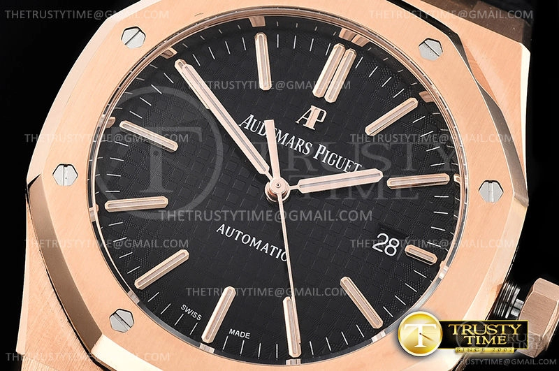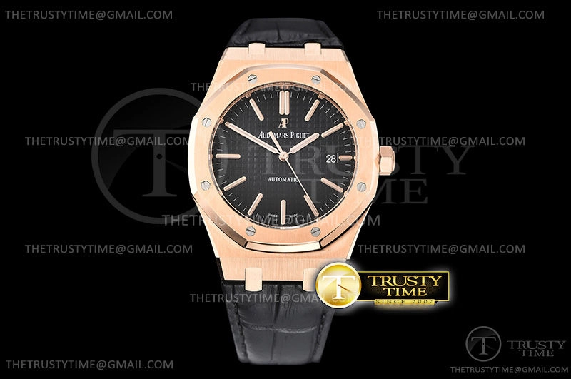 Часы Audemars Piguet из коллекции Royal Oak. Классические мужские часы Audemars Piguet Royal Oak Automatic II 15400OR.OO.D002CR.01 премиального качества (Артикул магазина: AP-0687) оснащены надежным автоматическим механизмом с автоподзаводом (работает от амплитуды движения руки) калибра AP3120, в котором реализованы следующие функции: часовая, минутная и секундная стрелки, а так же дата. Восьмиугольный корпус часов розового цвета, имеющий размер 41 мм и высоту 10.7 мм превосходно дополнит образ и украсит запястье своего обладателя. Для изготовления часов Audemars Piguet Royal Oak Automatic II 15400OR.OO.D002CR.01 предлагаемых в нашем интернет-магазине, применяются нержавеющая сталь 316F высокого качества (Швейцарский стандарт), а так же сапфировое стекло высокой прочности, благодаря чему обеспечивается максимальная защита от сколов и механических повреждений. Отличительной чертой данной модели является черный циферблат, часовые индексы которого обеспечивают часовые метки. Завершает образ кожаный ремешок черного цвета с фирменной раскладывающейся застежкой Audemars Piguet. Водонепроницаемость данной модели составляет 30М (WR30) – допускается минимальное воздействие с водой.