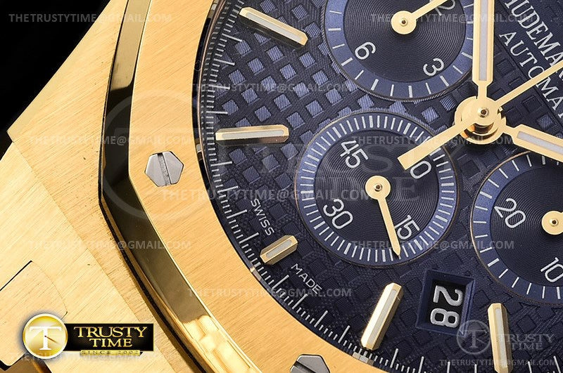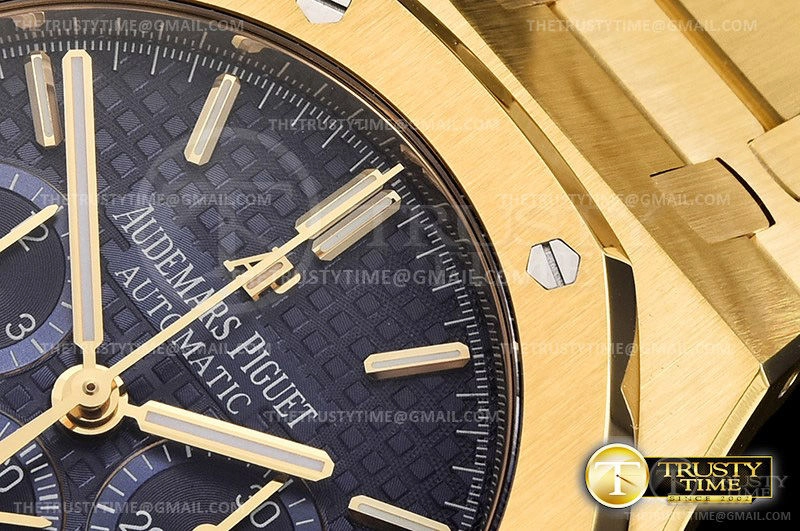 Часы Audemars Piguet из коллекции Royal Oak Chronograph. Спортивные мужские часы Audemars Piguet Royal Oak Chronograph 26320BA.OO.1220BA.02 премиального качества (Артикул магазина: AP-0760) оснащены надежным автоматическим механизмом с автоподзаводом (работает от амплитуды движения руки) калибра AP2385, в котором реализованы следующие функции: часовая, минутная и секундная стрелки, а так же хронограф, дата. Восьмиугольный корпус часов цветы желтой золота, имеющий размер 41 мм и высоту 15 мм превосходно дополнит образ и украсит запястье своего обладателя. Для изготовления часов Audemars Piguet Royal Oak Chronograph 26320BA.OO.1220BA.02 предлагаемых в нашем интернет-магазине, применяются нержавеющая сталь 316F высокого качества (Швейцарский стандарт), а так же сапфировое стекло высокой прочности, благодаря чему обеспечивается максимальная защита от сколов и механических повреждений. Отличительной чертой данной модели является синий циферблат, часовые индексы которого обеспечивают часовые метки. Завершает образ браслет из нержавеющей стали цвета желтого золота с фирменной раскладывающейся застежкой Audemars Piguet. Водонепроницаемость данной модели составляет 30М (WR30) – допускается минимальное воздействие с водой.