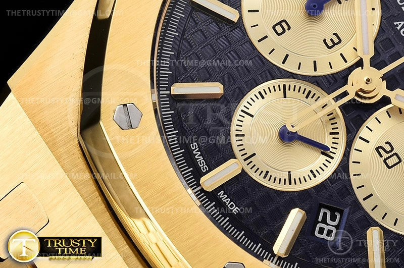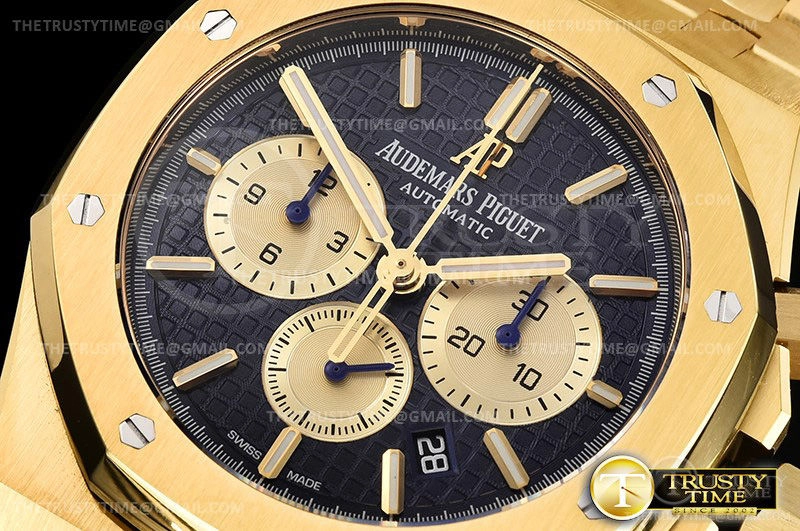 Часы Audemars Piguet из коллекции Royal Oak Chronograph. Спортивные мужские часы Audemars Piguet Royal Oak Chronograph 26331BA.OO.1220BA.01 премиального качества (Артикул магазина: AP-0761) оснащены надежным автоматическим механизмом с автоподзаводом (работает от амплитуды движения руки) калибра AP2385, в котором реализованы следующие функции: часовая, минутная и секундная стрелки, а так же хронограф, дата. Восьмиугольный корпус часов цветы желтой золота, имеющий размер 41 мм и высоту 15 мм превосходно дополнит образ и украсит запястье своего обладателя. Для изготовления часов Audemars Piguet Royal Oak Chronograph 26331BA.OO.1220BA.01 предлагаемых в нашем интернет-магазине, применяются нержавеющая сталь 316F высокого качества (Швейцарский стандарт), а так же сапфировое стекло высокой прочности, благодаря чему обеспечивается максимальная защита от сколов и механических повреждений. Отличительной чертой данной модели является синий циферблат, часовые индексы которого обеспечивают часовые метки. Завершает образ браслет из нержавеющей стали цвета желтого золота с фирменной раскладывающейся застежкой Audemars Piguet. Водонепроницаемость данной модели составляет 30М (WR30) – допускается минимальное воздействие с водой.
