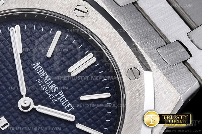 Часы Audemars Piguet из коллекции Royal Oak Jumbo. Классические мужские часы Audemars Piguet Royal Oak Jumbo Extra-thin 15202ST.OO.1240ST.01 премиального качества (Артикул магазина: AP-0972) оснащены надежным автоматическим механизмом с автоподзаводом (работает от амплитуды движения руки) калибра AP2121, в котором реализованы следующие функции: часова и минутка стрелки, а так же дата. Восьмиугольный корпус часов стального цвета, имеющий размер 39 мм и высоту 8.7 мм превосходно дополнит образ и украсит запястье своего обладателя. Для изготовления часов Audemars Piguet Royal Oak Jumbo Extra-thin 15202ST.OO.1240ST.01 предлагаемых в нашем интернет-магазине, применяются нержавеющая сталь 316F высокого качества (Швейцарский стандарт), а так же сапфировое стекло высокой прочности, благодаря чему обеспечивается максимальная защита от сколов и механических повреждений. Отличительной чертой данной модели является синий циферблат, часовые индексы которого обеспечивают часовые метки. Завершает образ браслет из нержавеющей стали стального цвета с фирменной раскладывающейся застежкой Audemars Piguet. Водонепроницаемость данной модели составляет 30М (WR30) – допускается минимальное воздействие с водой.