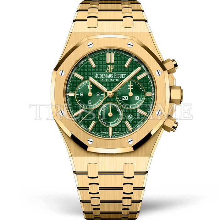Часы Audemars Piguet из коллекции Royal Oak Chronograph. Спортивные мужские часы Audemars Piguet Royal Oak Selfwinding Chronograph 26331BA.OO.1220BA.02 премиального качества (Артикул магазина: AP-1014) оснащены надежным автоматическим механизмом с автоподзаводом (работает от амплитуды движения руки) калибра AP2385, в котором реализованы следующие функции: часовая, минутная и секундная стрелки, а так же хронограф, дата. Восьмиугольный корпус часов цветы желтой золота, имеющий размер 41 мм и высоту 15 мм превосходно дополнит образ и украсит запястье своего обладателя. Для изготовления часов Audemars Piguet Royal Oak Selfwinding Chronograph 26331BA.OO.1220BA.02 предлагаемых в нашем интернет-магазине, применяются нержавеющая сталь 316F высокого качества (Швейцарский стандарт), а так же сапфировое стекло высокой прочности, благодаря чему обеспечивается максимальная защита от сколов и механических повреждений. Отличительной чертой данной модели является зеленый циферблат, часовые индексы которого обеспечивают часовые метки. Завершает образ браслет из нержавеющей стали цвета желтого золота с фирменной раскладывающейся застежкой Audemars Piguet. Водонепроницаемость данной модели составляет 30М (WR30) – допускается минимальное воздействие с водой.
