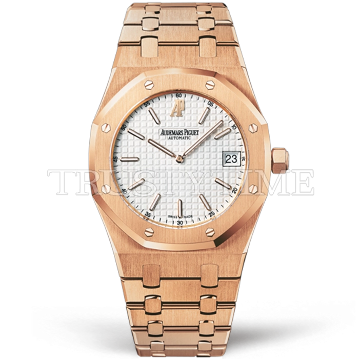 Часы Audemars Piguet из коллекции Royal Oak Jumbo. Классические мужские часы Audemars Piguet Royal Oak Jumbo Extra-Thin 15202OR.OO.0944OR.01 премиального качества (Артикул магазина: AP-1129) оснащены надежным автоматическим механизмом с автоподзаводом (работает от амплитуды движения руки) калибра AP2121, в котором реализованы следующие функции: часова и минутка стрелки, а так же дата. Восьмиугольный корпус часов розового цвета, имеющий размер 39 мм и высоту 9 мм превосходно дополнит образ и украсит запястье своего обладателя. Для изготовления часов Audemars Piguet Royal Oak Jumbo Extra-Thin 15202OR.OO.0944OR.01 предлагаемых в нашем интернет-магазине, применяются нержавеющая сталь 316F высокого качества (Швейцарский стандарт), а так же сапфировое стекло высокой прочности, благодаря чему обеспечивается максимальная защита от сколов и механических повреждений. Отличительной чертой данной модели является белый циферблат, часовые индексы которого обеспечивают часовые метки. Завершает образ браслет из нержавеющей стали цвета розового золота с фирменной раскладывающейся застежкой Audemars Piguet. Водонепроницаемость данной модели составляет 30М (WR30) – допускается минимальное воздействие с водой.