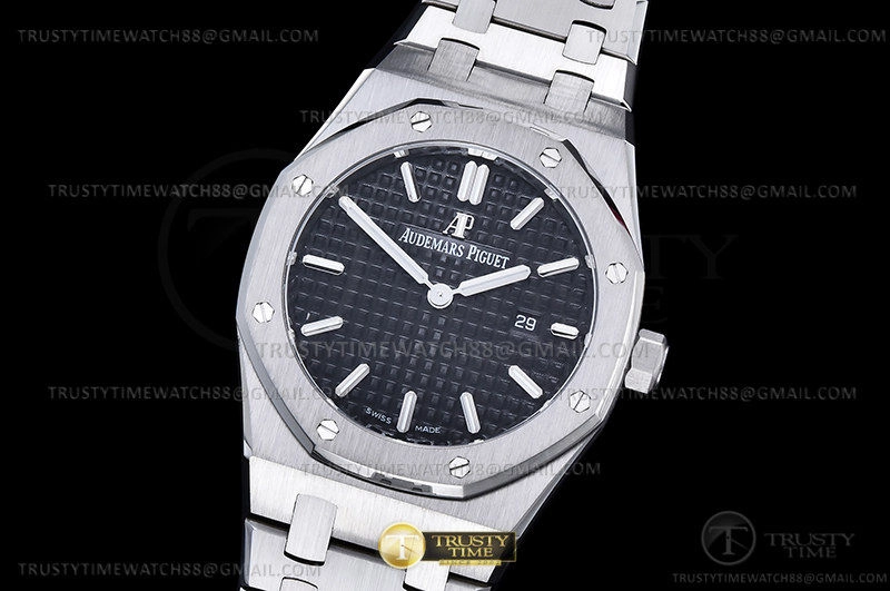 Часы Audemars Piguet из коллекции Royal Oak. Классические женские часы Audemars Piguet Royal Oak Ladies 33mm 67650ST.OO.1261ST.01 премиального качества (Артикул магазина: AP-1078) оснащены надежным кварцевым механизмом (работает от батареи) калибра Quartz ETA F04.115, в котором реализованы следующие функции: часовая, минутная и секундная стрелки, а так же дата. Восьмиугольный корпус часов стального цвета, имеющий размер 33 мм и высоту 7.2 мм превосходно дополнит образ и украсит запястье своего обладателя. Для изготовления часов Audemars Piguet Royal Oak Ladies 33mm 67650ST.OO.1261ST.01 предлагаемых в нашем интернет-магазине, применяются нержавеющая сталь 316L высокого качества (Швейцарский стандарт), а так же сапфировое стекло высокой прочности, благодаря чему обеспечивается максимальная защита от сколов и механических повреждений. Отличительной чертой данной модели является черный циферблат, часовые индексы которого обеспечивают часовые метки. Завершает образ браслет из нержавеющей стали стального цвета с фирменной раскладывающейся застежкой Audemars Piguet. Водонепроницаемость данной модели составляет 30М (WR30) – допускается минимальное воздействие с водой.