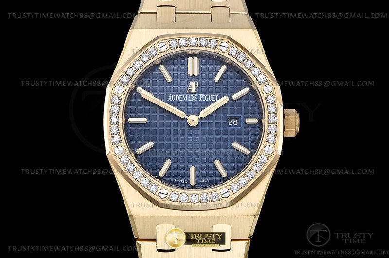 Часы Audemars Piguet из коллекции Royal Oak. Классические женские часы Audemars Piguet Royal Oak Ladies 33mm 67651BA.ZZ.1261BA.02 премиального качества (Артикул магазина: AP-0734) оснащены надежным кварцевым механизмом (работает от батареи) калибра Quartz ETA F04.115, в котором реализованы следующие функции: часова и минутка стрелки, а так же дата. Восьмиугольный корпус часов цветы желтой золота, имеющий размер 33 мм и высоту 7.5 мм превосходно дополнит образ и украсит запястье своего обладателя. Для изготовления часов Audemars Piguet Royal Oak Ladies 33mm 67651BA.ZZ.1261BA.02 предлагаемых в нашем интернет-магазине, применяются нержавеющая сталь 316L высокого качества (Швейцарский стандарт), а так же сапфировое стекло высокой прочности, благодаря чему обеспечивается максимальная защита от сколов и механических повреждений. Отличительной чертой данной модели является синий циферблат, часовые индексы которого обеспечивают часовые метки. Завершает образ браслет из нержавеющей стали цвета желтого золота с фирменной раскладывающейся застежкой Audemars Piguet. Водонепроницаемость данной модели составляет 30М (WR30) – допускается минимальное воздействие с водой.