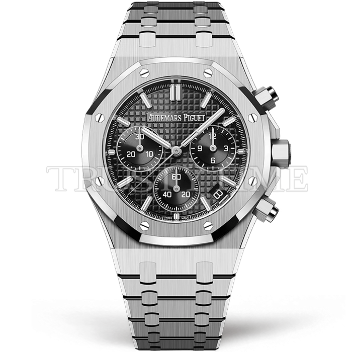 Часы Audemars Piguet из коллекции Royal Oak Chronograph. Спортивные мужские часы Audemars Piguet Royal Oak Selfwinding Chronograph 26240ST.OO.1320ST.06 премиального качества (Артикул магазина: AP-1186) оснащены надежным автоматическим механизмом с автоподзаводом (работает от амплитуды движения руки) калибра AP4401, в котором реализованы следующие функции: часовая, минутная и секундная стрелки, а так же дата, хронограф с функцией flyback (мгновенный перезапуск) в наручных часах (chronograph) — это усложнение, которое позволяет мгновенно сбрасывать показания секундомера одним нажатием кнопки. В обычных хронографах для сброса показаний нужно сначала остановить часы, а затем начать заново. Восьмиугольный корпус часов стального цвета, имеющий размер 41 мм и высоту 12.4 мм превосходно дополнит образ и украсит запястье своего обладателя. Для изготовления часов Audemars Piguet Royal Oak Selfwinding Chronograph 26240ST.OO.1320ST.06 предлагаемых в нашем интернет-магазине, применяются нержавеющая сталь 316F высокого качества (Швейцарский стандарт), а так же сапфировое стекло высокой прочности, благодаря чему обеспечивается максимальная защита от сколов и механических повреждений. Отличительной чертой данной модели является черный циферблат, часовые индексы которого обеспечивают часовые метки. Завершает образ браслет из нержавеющей стали стального цвета с фирменной раскладывающейся застежкой Audemars Piguet. Водонепроницаемость данной модели составляет 30М (WR30) – допускается минимальное воздействие с водой.