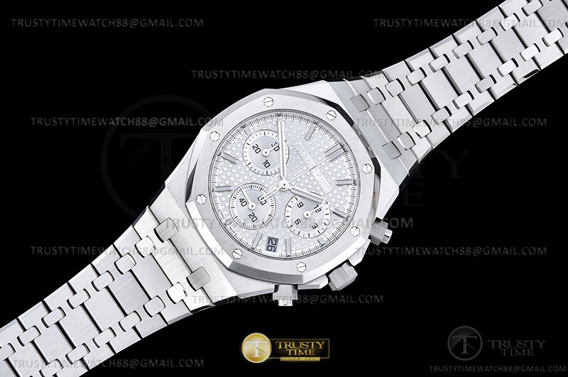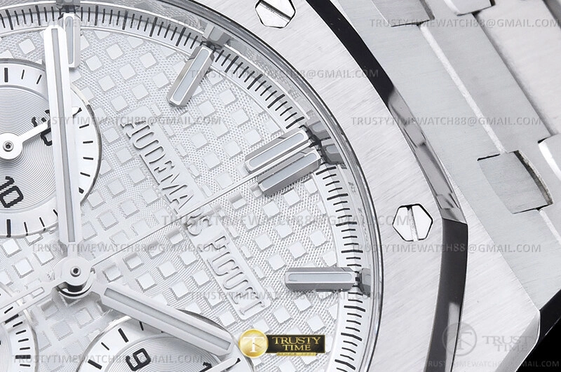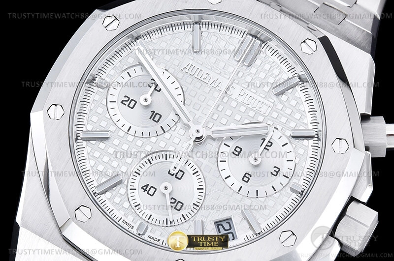 Часы Audemars Piguet из коллекции Royal Oak Chronograph. Спортивные мужские часы Audemars Piguet Royal Oak Selfwinding Chronograph 26240ST.OO.1320ST.07 премиального качества (Артикул магазина: AP-1187) оснащены надежным автоматическим механизмом с автоподзаводом (работает от амплитуды движения руки) калибра AP4401, в котором реализованы следующие функции: часовая, минутная и секундная стрелки, а так же дата, хронограф с функцией flyback (мгновенный перезапуск) в наручных часах (chronograph) — это усложнение, которое позволяет мгновенно сбрасывать показания секундомера одним нажатием кнопки. В обычных хронографах для сброса показаний нужно сначала остановить часы, а затем начать заново. Восьмиугольный корпус часов стального цвета, имеющий размер 41 мм и высоту 12.4 мм превосходно дополнит образ и украсит запястье своего обладателя. Для изготовления часов Audemars Piguet Royal Oak Selfwinding Chronograph 26240ST.OO.1320ST.07 предлагаемых в нашем интернет-магазине, применяются нержавеющая сталь 316F высокого качества (Швейцарский стандарт), а так же сапфировое стекло высокой прочности, благодаря чему обеспечивается максимальная защита от сколов и механических повреждений. Отличительной чертой данной модели является белый циферблат, часовые индексы которого обеспечивают часовые метки. Завершает образ браслет из нержавеющей стали стального цвета с фирменной раскладывающейся застежкой Audemars Piguet. Водонепроницаемость данной модели составляет 30М (WR30) – допускается минимальное воздействие с водой.
