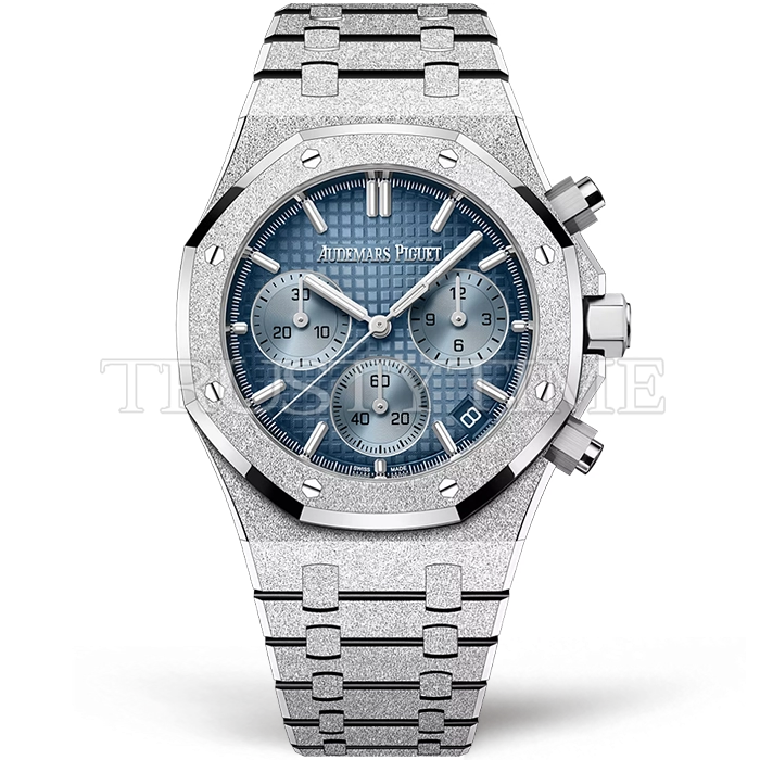 Часы Audemars Piguet из коллекции Royal Oak Chronograph. Спортивные мужские часы Audemars Piguet Royal Oak Frosted Gold Selfwinding Chronograph 26240BC.GG.1324BC.02 премиального качества (Артикул магазина: AP-1198) оснащены надежным автоматическим механизмом с автоподзаводом (работает от амплитуды движения руки) калибра AP4401, в котором реализованы следующие функции: часовая, минутная и секундная стрелки, а так же дата, хронограф с функцией flyback (мгновенный перезапуск) в наручных часах (chronograph) — это усложнение, которое позволяет мгновенно сбрасывать показания секундомера одним нажатием кнопки. В обычных хронографах для сброса показаний нужно сначала остановить часы, а затем начать заново. Восьмиугольный корпус часов стального цвета, имеющий размер 41 мм и высоту 12.4 мм превосходно дополнит образ и украсит запястье своего обладателя. Для изготовления часов Audemars Piguet Royal Oak Frosted Gold Selfwinding Chronograph 26240BC.GG.1324BC.02 предлагаемых в нашем интернет-магазине, применяются каменистая сталь 316F высокого качества (Швейцарский стандарт), а так же сапфировое стекло высокой прочности, благодаря чему обеспечивается максимальная защита от сколов и механических повреждений. Отличительной чертой данной модели является голубой циферблат, часовые индексы которого обеспечивают часовые метки. Завершает образ браслет из нержавеющей стали каменистой фактуры стального цвета с фирменной раскладывающейся застежкой Audemars Piguet. Водонепроницаемость данной модели составляет 30М (WR30) – допускается минимальное воздействие с водой.