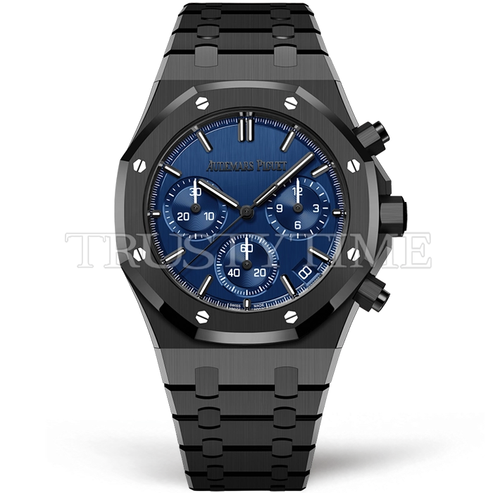 Часы Audemars Piguet из коллекции Royal Oak Chronograph. Спортивные мужские часы Audemars Piguet Royal Oak Selfwinding Chronograph "One Drop" 26240CE.OO.1225CE.98 премиального качества (Артикул магазина: AP-1201) оснащены надежным автоматическим механизмом с автоподзаводом (работает от амплитуды движения руки) калибра AP4401, в котором реализованы следующие функции: часовая, минутная и секундная стрелки, а так же дата, хронограф с функцией flyback (мгновенный перезапуск) в наручных часах (chronograph) — это усложнение, которое позволяет мгновенно сбрасывать показания секундомера одним нажатием кнопки. В обычных хронографах для сброса показаний нужно сначала остановить часы, а затем начать заново. Восьмиугольный корпус часов черного цвета, имеющий размер 41 мм и высоту 12.4 мм превосходно дополнит образ и украсит запястье своего обладателя. Для изготовления часов Audemars Piguet Royal Oak Selfwinding Chronograph "One Drop" 26240CE.OO.1225CE.98 предлагаемых в нашем интернет-магазине, применяются керамика высокого качества (Швейцарский стандарт), а так же сапфировое стекло высокой прочности, благодаря чему обеспечивается максимальная защита от сколов и механических повреждений. Отличительной чертой данной модели является синий циферблат, часовые индексы которого обеспечивают часовые метки. Завершает образ керамический браслет черного цвета с фирменной раскладывающейся застежкой Audemars Piguet. Водонепроницаемость данной модели составляет 30М (WR30) – допускается минимальное воздействие с водой.