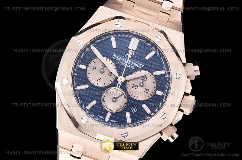 Часы Audemars Piguet из коллекции Royal Oak Chronograph. Спортивные мужские часы Audemars Piguet Royal Oak Selfwinding Chronograph 26331OR.OO.1220OR.01 премиального качества (Артикул магазина: AP-1231) оснащены надежным автоматическим механизмом с автоподзаводом (работает от амплитуды движения руки) калибра AP2385, в котором реализованы следующие функции: часовая, минутная и секундная стрелки, а так же дата, хронограф с функцией flyback (мгновенный перезапуск) в наручных часах (chronograph) — это усложнение, которое позволяет мгновенно сбрасывать показания секундомера одним нажатием кнопки. В обычных хронографах для сброса показаний нужно сначала остановить часы, а затем начать заново. Восьмиугольный корпус часов розового цвета, имеющий размер 41 мм и высоту 11 мм превосходно дополнит образ и украсит запястье своего обладателя. Для изготовления часов Audemars Piguet Royal Oak Selfwinding Chronograph 26331OR.OO.1220OR.01 предлагаемых в нашем интернет-магазине, применяются нержавеющая сталь 316F высокого качества (Швейцарский стандарт), а так же сапфировое стекло высокой прочности, благодаря чему обеспечивается максимальная защита от сколов и механических повреждений. Отличительной чертой данной модели является синий циферблат, часовые индексы которого обеспечивают часовые метки. Завершает образ браслет из нержавеющей стали цвета розового золота с фирменной раскладывающейся застежкой Audemars Piguet. Водонепроницаемость данной модели составляет 30М (WR30) – допускается минимальное воздействие с водой.