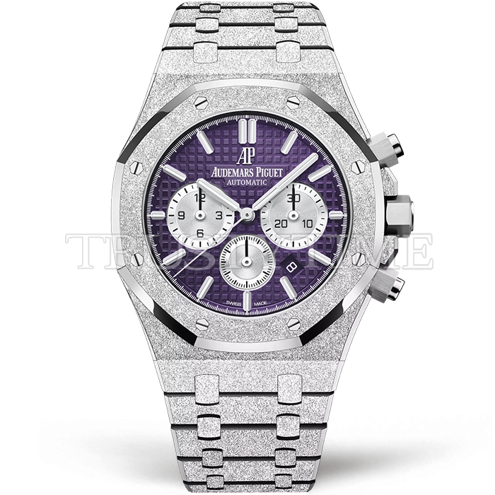 Часы Audemars Piguet из коллекции Royal Oak Chronograph. Спортивные мужские часы Audemars Piguet Royal Oak Frosted Gold Selfwinding Chronograph 26331BC.GG.1224BC.01 премиального качества (Артикул магазина: AP-1238) оснащены надежным автоматическим механизмом с автоподзаводом (работает от амплитуды движения руки) калибра AP2385, в котором реализованы следующие функции: часовая, минутная и секундная стрелки, а так же дата, хронограф с функцией flyback (мгновенный перезапуск) в наручных часах (chronograph) — это усложнение, которое позволяет мгновенно сбрасывать показания секундомера одним нажатием кнопки. В обычных хронографах для сброса показаний нужно сначала остановить часы, а затем начать заново. Восьмиугольный корпус часов розового цвета, имеющий размер 41 мм и высоту 11 мм превосходно дополнит образ и украсит запястье своего обладателя. Для изготовления часов Audemars Piguet Royal Oak Frosted Gold Selfwinding Chronograph 26331BC.GG.1224BC.01 предлагаемых в нашем интернет-магазине, применяются каменистая сталь 316F высокого качества (Швейцарский стандарт), а так же сапфировое стекло высокой прочности, благодаря чему обеспечивается максимальная защита от сколов и механических повреждений. Отличительной чертой данной модели является фиолетовый циферблат, часовые индексы которого обеспечивают часовые метки. Завершает образ браслет из нержавеющей стали каменистой фактуры стального цвета с фирменной раскладывающейся застежкой Audemars Piguet. Водонепроницаемость данной модели составляет 30М (WR30) – допускается минимальное воздействие с водой.