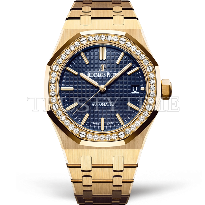 Часы Audemars Piguet из коллекции Royal Oak. Классические женские часы Audemars Piguet Royal Oak Automatic 15451BA.ZZ.1256BA.01 премиального качества (Артикул магазина: AP-1065) оснащены надежным автоматическим механизмом с автоподзаводом (работает от амплитуды движения руки) калибра AP3120, в котором реализованы следующие функции: часовая, минутная и секундная стрелки, а так же дата. Восьмиугольный корпус часов цветы желтой золота, имеющий размер 37 мм и высоту 9.7 мм превосходно дополнит образ и украсит запястье своего обладателя. Для изготовления часов Audemars Piguet Royal Oak Automatic 15451BA.ZZ.1256BA.01 предлагаемых в нашем интернет-магазине, применяются нержавеющая сталь 316L высокого качества (Швейцарский стандарт), а так же сапфировое стекло высокой прочности, благодаря чему обеспечивается максимальная защита от сколов и механических повреждений. Отличительной чертой данной модели является синий циферблат, часовые индексы которого обеспечивают часовые метки. Завершает образ браслет из нержавеющей стали цвета желтого золота с фирменной раскладывающейся застежкой Audemars Piguet. Водонепроницаемость данной модели составляет 30М (WR30) – допускается минимальное воздействие с водой.
