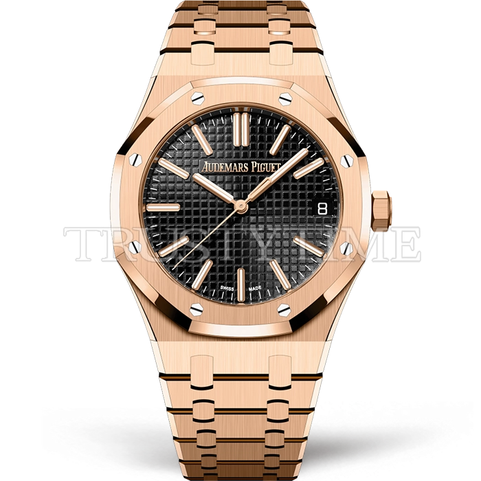 Часы Audemars Piguet из коллекции Royal Oak. Классические мужские часы Audemars Piguet Royal Oak Selfwinding 50th Anniversary 15510OR.OO.1320OR.02 премиального качества (Артикул магазина: AP-1103) оснащены надежным автоматическим механизмом с автоподзаводом (работает от амплитуды движения руки) калибра AP4302, в котором реализованы следующие функции: часовая, минутная и секундная стрелки, а так же дата. Восьмиугольный корпус часов розового цвета, имеющий размер 41 мм и высоту 10 мм превосходно дополнит образ и украсит запястье своего обладателя. Для изготовления часов Audemars Piguet Royal Oak Selfwinding 50th Anniversary 15510OR.OO.1320OR.02 предлагаемых в нашем интернет-магазине, применяются нержавеющая сталь 316F высокого качества (Швейцарский стандарт), а так же сапфировое стекло высокой прочности, благодаря чему обеспечивается максимальная защита от сколов и механических повреждений. Отличительной чертой данной модели является черный циферблат, часовые индексы которого обеспечивают часовые метки. Завершает образ браслет из нержавеющей стали цвета розового золота с фирменной раскладывающейся застежкой Audemars Piguet. Водонепроницаемость данной модели составляет 30М (WR30) – допускается минимальное воздействие с водой.