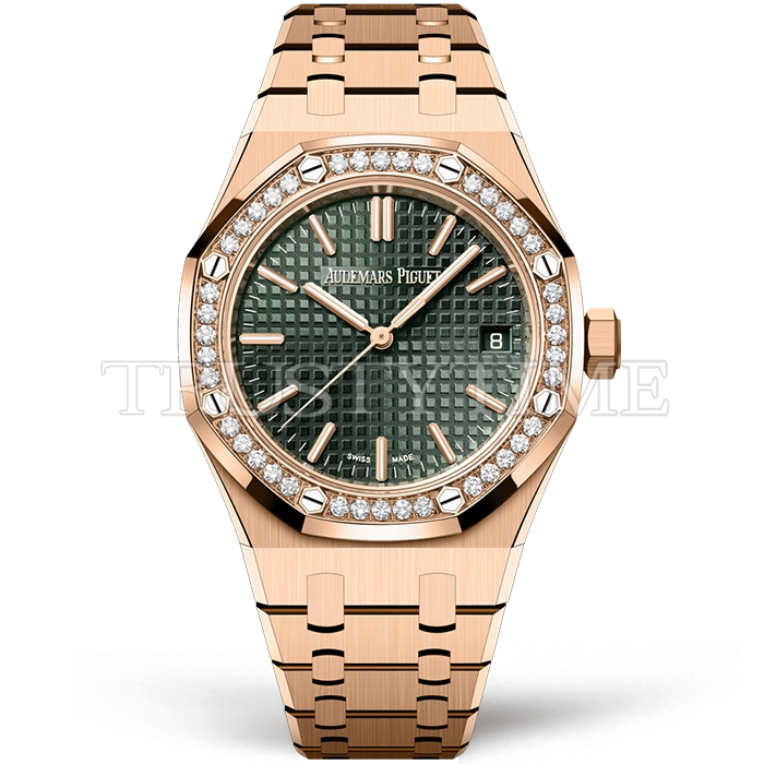 Часы Audemars Piguet из коллекции Royal Oak. Классические женские часы Audemars Piguet Royal Oak Selfwinding 15551OR.ZZ.1356OR.06 премиального качества (Артикул магазина: AP-1156) оснащены надежным автоматическим механизмом с автоподзаводом (работает от амплитуды движения руки) калибра AP5900, в котором реализованы следующие функции: часовая, минутная и секундная стрелки, а так же дата. Восьмиугольный корпус часов розового цвета, имеющий размер 37 мм и высоту 9.7 мм превосходно дополнит образ и украсит запястье своего обладателя. Для изготовления часов Audemars Piguet Royal Oak Selfwinding 15551OR.ZZ.1356OR.06 предлагаемых в нашем интернет-магазине, применяются нержавеющая сталь 316L высокого качества (Швейцарский стандарт), а так же сапфировое стекло высокой прочности, благодаря чему обеспечивается максимальная защита от сколов и механических повреждений. Отличительной чертой данной модели является зеленый циферблат, часовые индексы которого обеспечивают часовые метки. Завершает образ браслет из нержавеющей стали цвета розового золота с фирменной раскладывающейся застежкой Audemars Piguet. Водонепроницаемость данной модели составляет 30М (WR30) – допускается минимальное воздействие с водой.