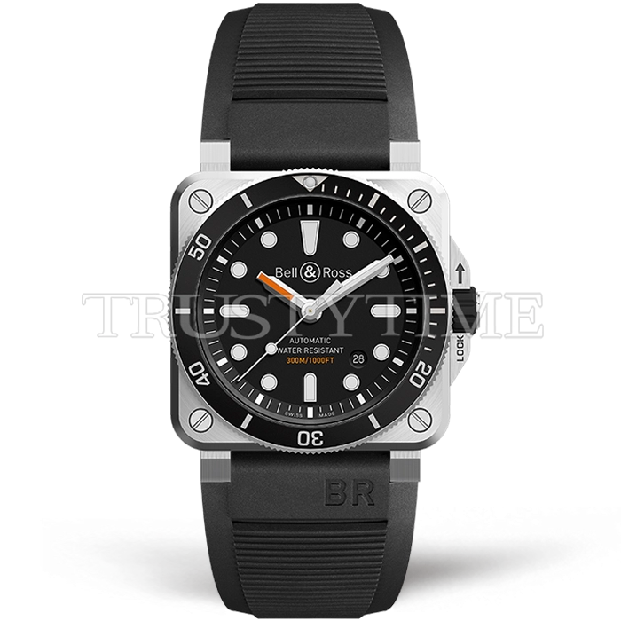 Часы Bell & Ross из коллекции BR 03-92. Спортивные мужские часы Bell & Ross BR 03-92 Diver BR0392-D-BL-ST/SRB премиального качества (Артикул магазина: BR-0293) оснащены надежным автоматическим механизмом с автоподзаводом (работает от амплитуды движения руки) калибра MY9015, в котором реализованы следующие функции: часовая, минутная и секундная стрелки, а так же дата. Квадратный корпус часов стального цвета, имеющий размер 42 мм X 42 мм и высоту 11 мм превосходно дополнит образ и украсит запястье своего обладателя. Для изготовления часов Bell & Ross BR 03-92 Diver BR0392-D-BL-ST/SRB предлагаемых в нашем интернет-магазине, применяются нержавеющая сталь 316L высокого качества (Швейцарский стандарт), а так же сапфировое стекло высокой прочности, благодаря чему обеспечивается максимальная защита от сколов и механических повреждений. Отличительной чертой данной модели является черный циферблат, часовые индексы которого обеспечивают часовые метки. Завершает образ каучуковый ремешок черного цвета с фирменной классической застежкой Bell & Ross. Водонепроницаемость данной модели составляет 30М (WR30) – допускается минимальное воздействие с водой.