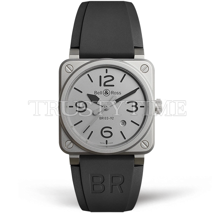 Часы Bell & Ross из коллекции BR 03-92. Классические мужские часы Bell & Ross BR 03-92 Horoblack BR0392-GBL-ST/SRB премиального качества (Артикул магазина: BR-0244) оснащены надежным автоматическим механизмом с автоподзаводом (работает от амплитуды движения руки) калибра MY9015, в котором реализованы следующие функции: часовая, минутная и секундная стрелки, а так же дата. Квадратный корпус часов стального цвета, имеющий размер 42 мм X 42 мм и высоту 11 мм превосходно дополнит образ и украсит запястье своего обладателя. Для изготовления часов Bell & Ross BR 03-92 Horoblack BR0392-GBL-ST/SRB предлагаемых в нашем интернет-магазине, применяются нержавеющая сталь 316L высокого качества (Швейцарский стандарт), а так же сапфировое стекло высокой прочности, благодаря чему обеспечивается максимальная защита от сколов и механических повреждений. Отличительной чертой данной модели является серый циферблат, часовые индексы которого обеспечивают часовые метки. Завершает образ каучуковый ремешок черного цвета с фирменной классической застежкой Bell & Ross. Водонепроницаемость данной модели составляет 30М (WR30) – допускается минимальное воздействие с водой.