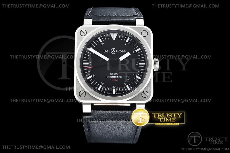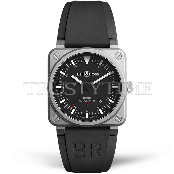 Часы Bell & Ross из коллекции BR 03-92. Классические мужские часы Bell & Ross BR 03-92 Horograph Sandblasted BR0392-HOR-BLC/SRB премиального качества (Артикул магазина: BR-0222) оснащены надежным автоматическим механизмом с автоподзаводом (работает от амплитуды движения руки) калибра MY9015, в котором реализованы следующие функции: часовая, минутная и секундная стрелки, а так же дата. Квадратный корпус часов стального цвета, имеющий размер 42 мм X 42 мм и высоту 11 мм превосходно дополнит образ и украсит запястье своего обладателя. Для изготовления часов Bell & Ross BR 03-92 Horograph Sandblasted BR0392-HOR-BLC/SRB предлагаемых в нашем интернет-магазине, применяются нержавеющая сталь 316L высокого качества (Швейцарский стандарт), а так же сапфировое стекло высокой прочности, благодаря чему обеспечивается максимальная защита от сколов и механических повреждений. Отличительной чертой данной модели является черный циферблат, часовые индексы которого обеспечивают часовые метки. Завершает образ каучуковый ремешок черного цвета с фирменной классической застежкой Bell & Ross. Водонепроницаемость данной модели составляет 30М (WR30) – допускается минимальное воздействие с водой.