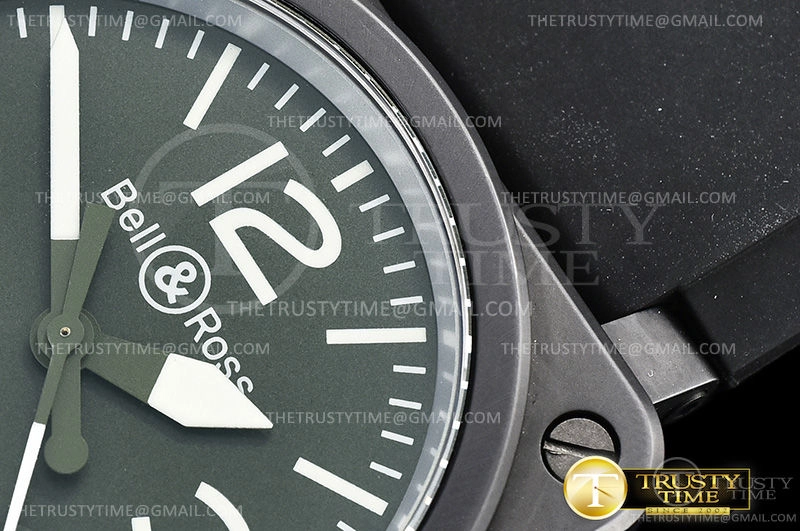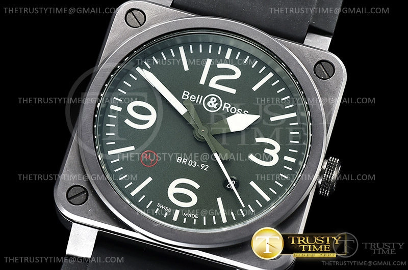Часы Bell & Ross из коллекции BR 03-92. Классические мужские часы Bell & Ross BR 03-92 Military Type BR0392-MIL-CE премиального качества (Артикул магазина: BR-0208) оснащены надежным автоматическим механизмом с автоподзаводом (работает от амплитуды движения руки) калибра MY9015, в котором реализованы следующие функции: часовая, минутная и секундная стрелки, а так же дата. Квадратный корпус часов черного цвета, имеющий размер 42 мм X 42 мм и высоту 11 мм превосходно дополнит образ и украсит запястье своего обладателя. Для изготовления часов Bell & Ross BR 03-92 Military Type BR0392-MIL-CE предлагаемых в нашем интернет-магазине, применяются керамика высокого качества (Швейцарский стандарт), а так же сапфировое стекло высокой прочности, благодаря чему обеспечивается максимальная защита от сколов и механических повреждений. Отличительной чертой данной модели является зеленый циферблат, часовые индексы которого обеспечивают часовые метки. Завершает образ каучуковый ремешок черного цвета с фирменной классической застежкой Bell & Ross. Водонепроницаемость данной модели составляет 30М (WR30) – допускается минимальное воздействие с водой.