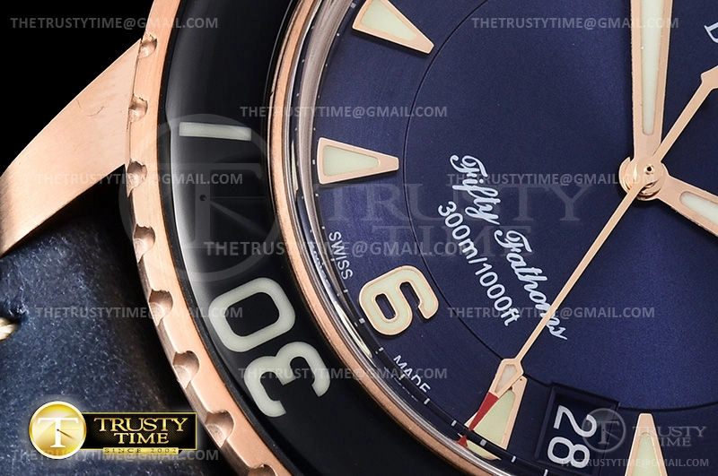 Часы Blancpain из коллекции Fifty Fathoms. Классические мужские часы Blancpain Fifty Fathoms 5015-3603C-63B премиального качества (Артикул магазина: BP-0283) оснащены надежным автоматическим механизмом с автоподзаводом (работает от амплитуды движения руки) калибра BP1315, в котором реализованы следующие функции: часовая, минутная и секундная стрелки, а так же дата. Круглый корпус часов розового цвета, имеющий размер 45 мм и высоту 15.5 мм превосходно дополнит образ и украсит запястье своего обладателя. Для изготовления часов Blancpain Fifty Fathoms 5015-3603C-63B предлагаемых в нашем интернет-магазине, применяются нержавеющая сталь 316F высокого качества (Швейцарский стандарт), а так же сапфировое стекло высокой прочности, благодаря чему обеспечивается максимальная защита от сколов и механических повреждений. Отличительной чертой данной модели является синий циферблат, часовые индексы которого обеспечивают часовые метки. Завершает образ кожаный ремешок синего цвета с фирменной раскладывающейся застежкой Blancpain. Водонепроницаемость данной модели составляет 30М (WR30) – допускается минимальное воздействие с водой.