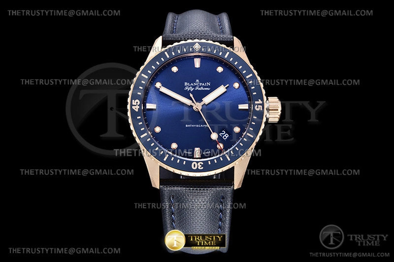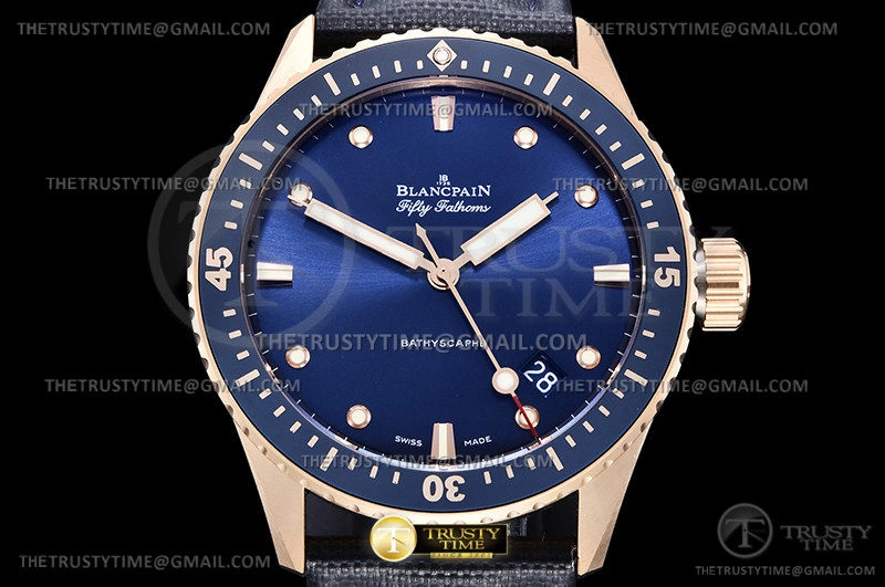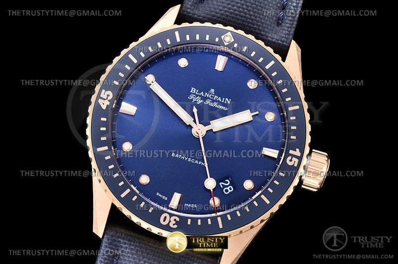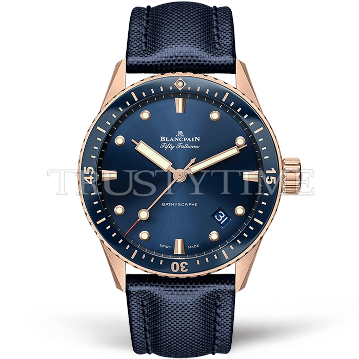 Часы Blancpain из коллекции Fifty Fathoms Bathyscaphe. Классические мужские часы Blancpain Fifty Fathoms Bathyscaphe 5000-36S40-O52A премиального качества (Артикул магазина: BP-0345) оснащены надежным автоматическим механизмом с автоподзаводом (работает от амплитуды движения руки) калибра BP1315, в котором реализованы следующие функции: часовая, минутная и секундная стрелки, а так же дата. Круглый корпус часов розового цвета, имеющий размер 45 мм и высоту 13.5 мм превосходно дополнит образ и украсит запястье своего обладателя. Для изготовления часов Blancpain Fifty Fathoms Bathyscaphe 5000-36S40-O52A предлагаемых в нашем интернет-магазине, применяются нержавеющая сталь 316F высокого качества (Швейцарский стандарт), а так же сапфировое стекло высокой прочности, благодаря чему обеспечивается максимальная защита от сколов и механических повреждений. Отличительной чертой данной модели является синий циферблат, часовые индексы которого обеспечивают часовые метки. Завершает образ нейлоновый ремешок синего цвета с фирменной классической застежкой Blancpain. Водонепроницаемость данной модели составляет 30М (WR30) – допускается минимальное воздействие с водой.