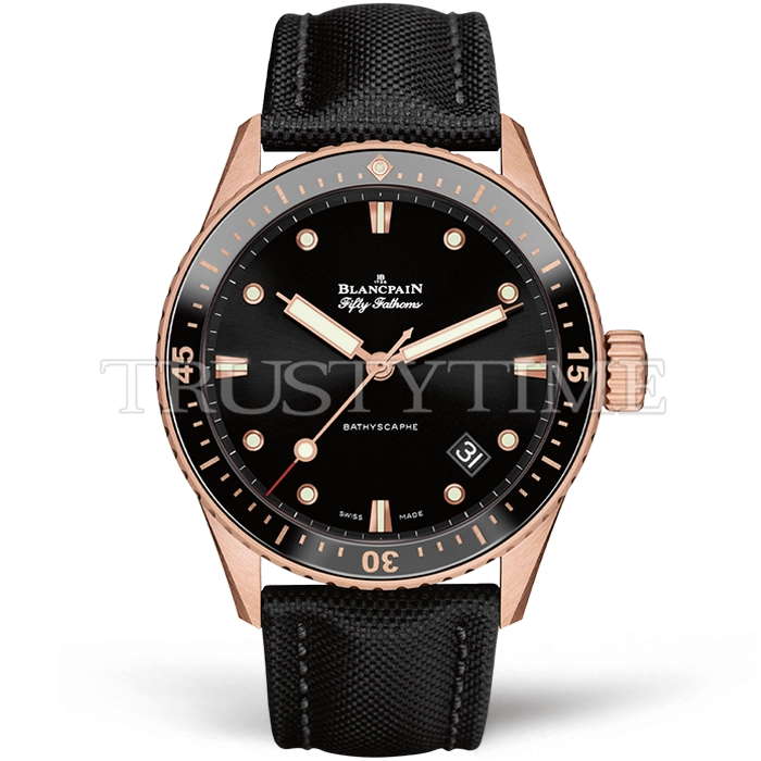 Часы Blancpain из коллекции Fifty Fathoms Bathyscaphe. Классические мужские часы Blancpain Fifty Fathoms Bathyscaphe 5000-36S30-B52A премиального качества (Артикул магазина: BP-0346) оснащены надежным автоматическим механизмом с автоподзаводом (работает от амплитуды движения руки) калибра BP1315, в котором реализованы следующие функции: часовая, минутная и секундная стрелки, а так же дата. Круглый корпус часов розового цвета, имеющий размер 45 мм и высоту 13.5 мм превосходно дополнит образ и украсит запястье своего обладателя. Для изготовления часов Blancpain Fifty Fathoms Bathyscaphe 5000-36S30-B52A предлагаемых в нашем интернет-магазине, применяются нержавеющая сталь 316F высокого качества (Швейцарский стандарт), а так же сапфировое стекло высокой прочности, благодаря чему обеспечивается максимальная защита от сколов и механических повреждений. Отличительной чертой данной модели является черный циферблат, часовые индексы которого обеспечивают часовые метки. Завершает образ нейлоновый ремешок черного цвета с фирменной классической застежкой Blancpain. Водонепроницаемость данной модели составляет 30М (WR30) – допускается минимальное воздействие с водой.