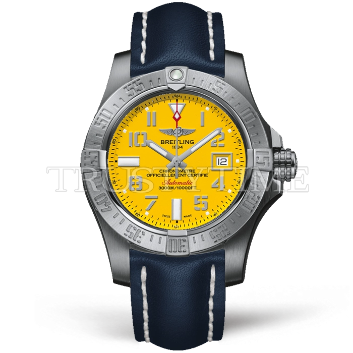 Часы Breitling из коллекции Avenger II. Спортивные мужские часы Breitling Avenger II Seawolf 45 A1733110/I519/112X/A20DSA.1 премиального качества (Артикул магазина: BT-0813) оснащены надежным автоматическим механизмом с автоподзаводом (работает от амплитуды движения руки) калибра ETA2824-2, в котором реализованы следующие функции: часовая, минутная и секундная стрелки, а так же хронограф, дата. Круглый корпус часов стального цвета, имеющий размер 45 мм и высоту 17 мм превосходно дополнит образ и украсит запястье своего обладателя. Для изготовления часов Breitling Avenger II Seawolf 45 A1733110/I519/112X/A20DSA.1 предлагаемых в нашем интернет-магазине, применяются нержавеющая сталь 316F высокого качества (Швейцарский стандарт), а так же сапфировое стекло высокой прочности, благодаря чему обеспечивается максимальная защита от сколов и механических повреждений. Отличительной чертой данной модели является желтый циферблат, часовые индексы которого обеспечивают арабские цифры. Завершает образ кожаный ремешок синего цвета с фирменной раскладывающейся застежкой Breitling. Водонепроницаемость данной модели составляет 30М (WR30) – допускается минимальное воздействие с водой.