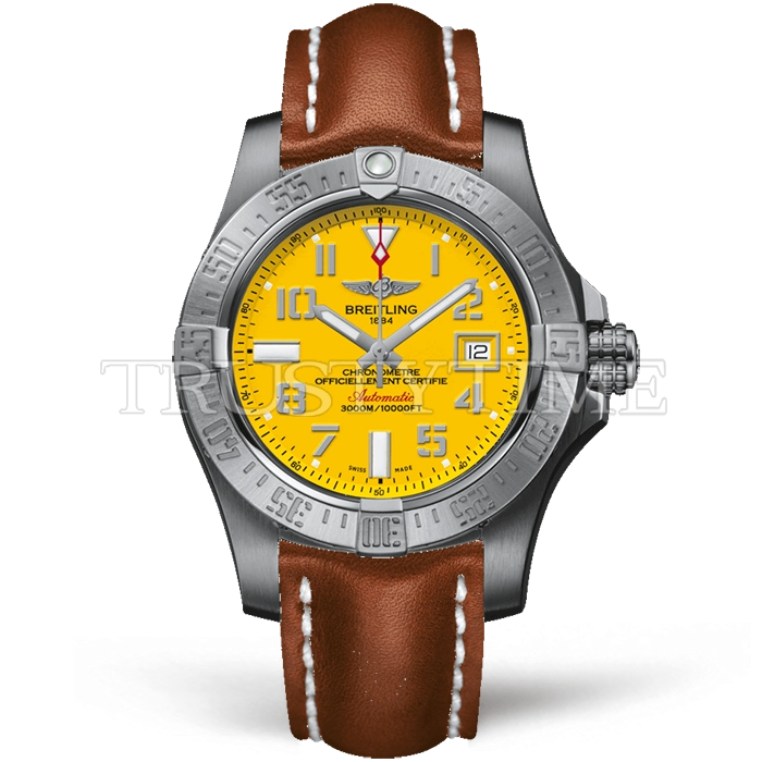 Часы Breitling из коллекции Avenger II. Спортивные мужские часы Breitling Avenger II Seawolf 45 A1733110/I519/434X/A20DSA.1 премиального качества (Артикул магазина: BT-0817) оснащены надежным автоматическим механизмом с автоподзаводом (работает от амплитуды движения руки) калибра ETA2824-2, в котором реализованы следующие функции: часовая, минутная и секундная стрелки, а так же хронограф, дата. Круглый корпус часов стального цвета, имеющий размер 45 мм и высоту 17 мм превосходно дополнит образ и украсит запястье своего обладателя. Для изготовления часов Breitling Avenger II Seawolf 45 A1733110/I519/434X/A20DSA.1 предлагаемых в нашем интернет-магазине, применяются нержавеющая сталь 316F высокого качества (Швейцарский стандарт), а так же сапфировое стекло высокой прочности, благодаря чему обеспечивается максимальная защита от сколов и механических повреждений. Отличительной чертой данной модели является желтый циферблат, часовые индексы которого обеспечивают арабские цифры. Завершает образ кожаный ремешок коричневого цвета с фирменной раскладывающейся застежкой Breitling. Водонепроницаемость данной модели составляет 30М (WR30) – допускается минимальное воздействие с водой.