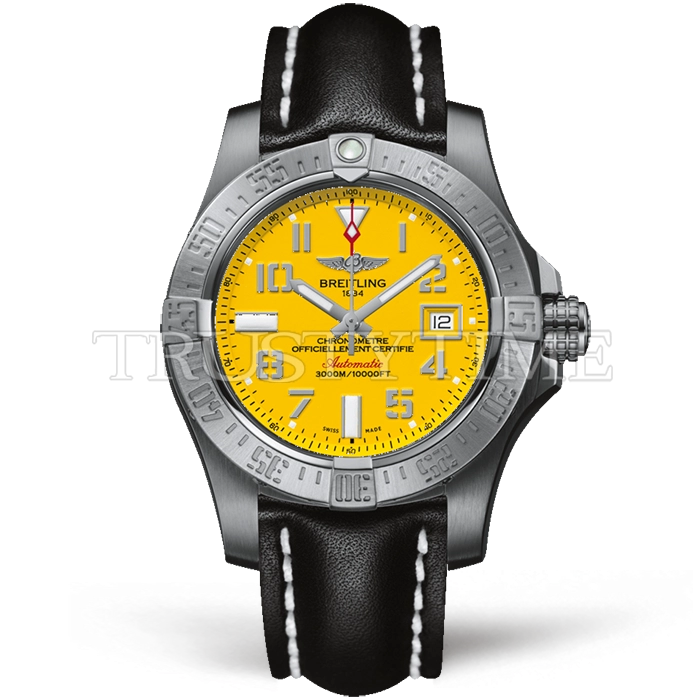 Часы Breitling из коллекции Avenger II. Спортивные мужские часы Breitling Avenger II Seawolf 45 A1733110/I519/435X/A20BASA.1 премиального качества (Артикул магазина: BT-0818) оснащены надежным автоматическим механизмом с автоподзаводом (работает от амплитуды движения руки) калибра ETA2824-2, в котором реализованы следующие функции: часовая, минутная и секундная стрелки, а так же хронограф, дата. Круглый корпус часов стального цвета, имеющий размер 45 мм и высоту 17 мм превосходно дополнит образ и украсит запястье своего обладателя. Для изготовления часов Breitling Avenger II Seawolf 45 A1733110/I519/435X/A20BASA.1 предлагаемых в нашем интернет-магазине, применяются нержавеющая сталь 316F высокого качества (Швейцарский стандарт), а так же сапфировое стекло высокой прочности, благодаря чему обеспечивается максимальная защита от сколов и механических повреждений. Отличительной чертой данной модели является желтый циферблат, часовые индексы которого обеспечивают арабские цифры. Завершает образ кожаный ремешок черного цвета с фирменной классической застежкой Breitling. Водонепроницаемость данной модели составляет 30М (WR30) – допускается минимальное воздействие с водой.