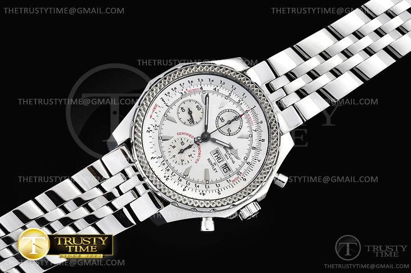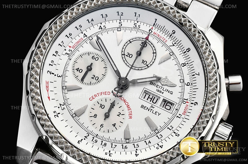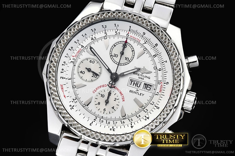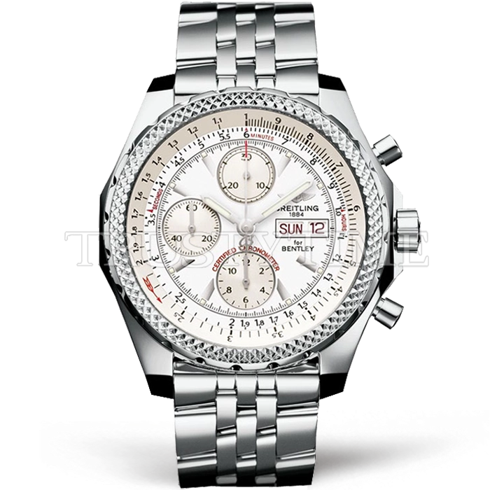 Часы Breitling из коллекции Bentley GT. Спортивные мужские часы Breitling for Bentley GT A133628X/A786/980A премиального качества (Артикул магазина: BT-0387) оснащены надежным автоматическим механизмом с автоподзаводом (работает от амплитуды движения руки) калибра Valjoux-7750, в котором реализованы следующие функции: часовая, минутная и секундная стрелки, а так же хронограф, дата, день недели. Круглый корпус часов стального цвета, имеющий размер 45 мм и высоту 15.5 мм превосходно дополнит образ и украсит запястье своего обладателя. Для изготовления часов Breitling for Bentley GT A133628X/A786/980A предлагаемых в нашем интернет-магазине, применяются нержавеющая сталь 316F высокого качества (Швейцарский стандарт), а так же сапфировое стекло высокой прочности, благодаря чему обеспечивается максимальная защита от сколов и механических повреждений. Отличительной чертой данной модели является белый циферблат, часовые индексы которого обеспечивают часовые метки. Завершает образ браслет из нержавеющей стали стального цвета с фирменной раскладывающейся застежкой Breitling. Водонепроницаемость данной модели составляет 30М (WR30) – допускается минимальное воздействие с водой.