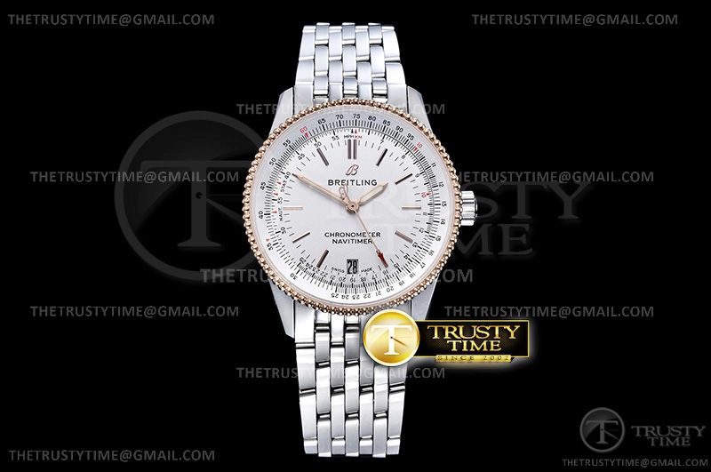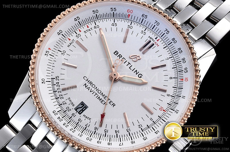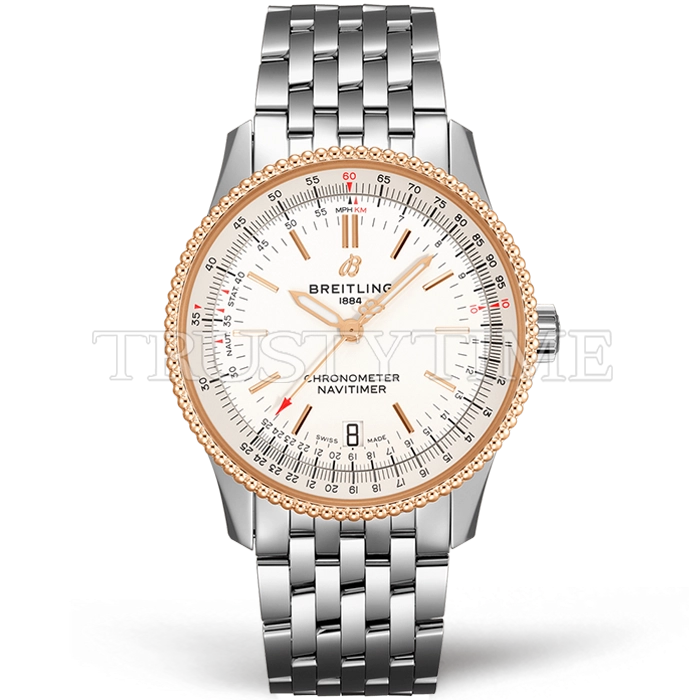 Часы Breitling из коллекции Navitimer. Классические мужские часы Breitling Navitimer Automatic 38 U17325211G1A1 премиального качества (Артикул магазина: BT-0437) оснащены надежным автоматическим механизмом с автоподзаводом (работает от амплитуды движения руки) калибра ETA2824-2, в котором реализованы следующие функции: часовая, минутная и секундная стрелки, а так же дата. Круглый корпус часов комбинированного сталь с розового золота цвета, имеющий размер 38 мм и высоту 10 мм превосходно дополнит образ и украсит запястье своего обладателя. Для изготовления часов Breitling Navitimer Automatic 38 U17325211G1A1 предлагаемых в нашем интернет-магазине, применяются нержавеющая сталь 316L высокого качества (Швейцарский стандарт), а так же сапфировое стекло высокой прочности, благодаря чему обеспечивается максимальная защита от сколов и механических повреждений. Отличительной чертой данной модели является белый циферблат, часовые индексы которого обеспечивают часовые метки. Завершает образ браслет из нержавеющей стали стального цвета с фирменной раскладывающейся застежкой Breitling. Водонепроницаемость данной модели составляет 30М (WR30) – допускается минимальное воздействие с водой.