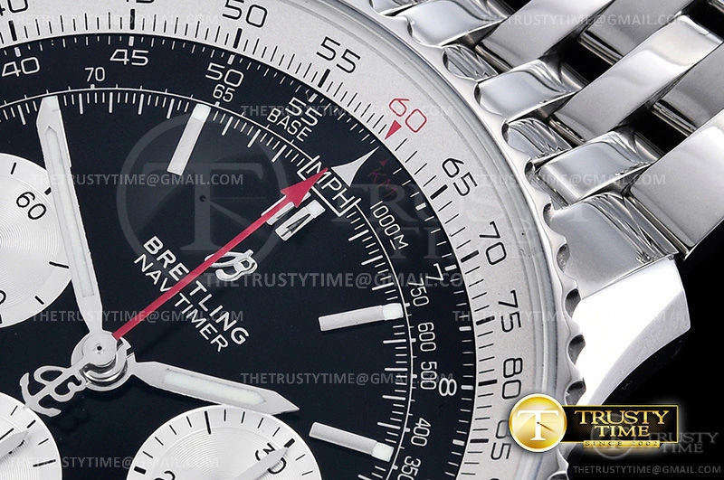 Часы Breitling из коллекции Navitimer Chronograph. Спортивные мужские часы Breitling Navitimer B01 Chronograph 43 AB0121211B1A1 премиального качества (Артикул магазина: BT-0443) оснащены надежным автоматическим механизмом с автоподзаводом (работает от амплитуды движения руки) калибра Valjoux-7750, в котором реализованы следующие функции: часовая, минутная и секундная стрелки, а так же хронограф, дата. Круглый корпус часов стального цвета, имеющий размер 43 мм и высоту 15.5 мм превосходно дополнит образ и украсит запястье своего обладателя. Для изготовления часов Breitling Navitimer B01 Chronograph 43 AB0121211B1A1 предлагаемых в нашем интернет-магазине, применяются нержавеющая сталь 316L высокого качества (Швейцарский стандарт), а так же сапфировое стекло высокой прочности, благодаря чему обеспечивается максимальная защита от сколов и механических повреждений. Отличительной чертой данной модели является черный циферблат, часовые индексы которого обеспечивают часовые метки. Завершает образ браслет из нержавеющей стали стального цвета с фирменной раскладывающейся застежкой Breitling. Водонепроницаемость данной модели составляет 30М (WR30) – допускается минимальное воздействие с водой.
