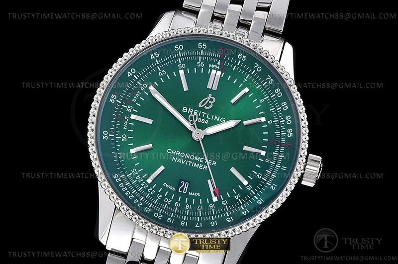 Часы Breitling из коллекции Navitimer. Классические мужские часы Breitling Navitimer Automatic 41 A17326361L1A1 премиального качества (Артикул магазина: BT-0652) оснащены надежным автоматическим механизмом с автоподзаводом (работает от амплитуды движения руки) калибра ETA2824-2, в котором реализованы следующие функции: часовая, минутная и секундная стрелки, а так же дата. Круглый корпус часов стального цвета, имеющий размер 41 мм и высоту 11 мм превосходно дополнит образ и украсит запястье своего обладателя. Для изготовления часов Breitling Navitimer Automatic 41 A17326361L1A1 предлагаемых в нашем интернет-магазине, применяются нержавеющая сталь 316L высокого качества (Швейцарский стандарт), а так же сапфировое стекло высокой прочности, благодаря чему обеспечивается максимальная защита от сколов и механических повреждений. Отличительной чертой данной модели является зеленый циферблат, часовые индексы которого обеспечивают часовые метки. Завершает образ браслет из нержавеющей стали стального цвета с фирменной раскладывающейся застежкой Breitling. Водонепроницаемость данной модели составляет 30М (WR30) – допускается минимальное воздействие с водой.