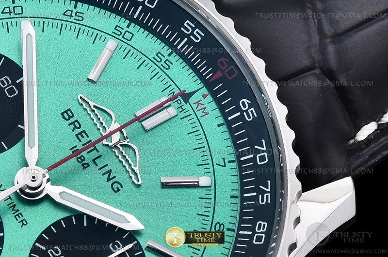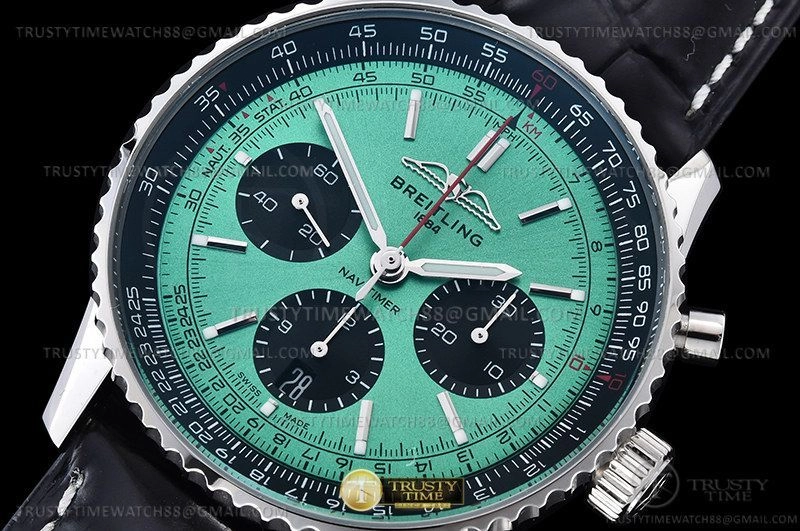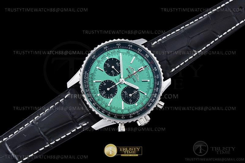 Часы Breitling из коллекции Navitimer B01. Спортивные мужские часы Breitling Navitimer B01 Chronograph 43 AB0138241L1P1 премиального качества (Артикул магазина: BT-0659) оснащены надежным автоматическим механизмом с автоподзаводом (работает от амплитуды движения руки) калибра Valjoux-7750, в котором реализованы следующие функции: часовая, минутная и секундная стрелки, а так же хронограф, дата. Круглый корпус часов стального цвета, имеющий размер 43 мм и высоту 16 мм превосходно дополнит образ и украсит запястье своего обладателя. Для изготовления часов Breitling Navitimer B01 Chronograph 43 AB0138241L1P1 предлагаемых в нашем интернет-магазине, применяются нержавеющая сталь 316L высокого качества (Швейцарский стандарт), а так же сапфировое стекло высокой прочности, благодаря чему обеспечивается максимальная защита от сколов и механических повреждений. Отличительной чертой данной модели является зеленый циферблат, часовые индексы которого обеспечивают часовые метки. Завершает образ кожаный ремешок черного цвета с фирменной раскладывающейся застежкой Breitling. Водонепроницаемость данной модели составляет 30М (WR30) – допускается минимальное воздействие с водой.