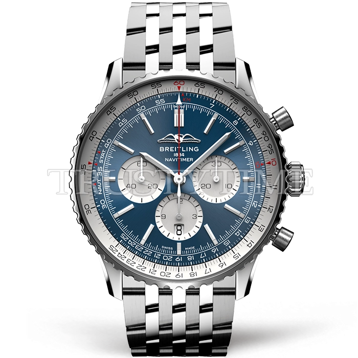 Часы Breitling из коллекции Navitimer B01. Спортивные мужские часы Breitling Navitimer B01 Chronograph 46 AB0137211C1A1 премиального качества (Артикул магазина: BT-1075) оснащены надежным автоматическим механизмом с автоподзаводом (работает от амплитуды движения руки) калибра Valjoux-7750, в котором реализованы следующие функции: часовая, минутная и секундная стрелки, а так же хронограф, дата. Круглый корпус часов стального цвета, имеющий размер 46 мм и высоту 15 мм превосходно дополнит образ и украсит запястье своего обладателя. Для изготовления часов Breitling Navitimer B01 Chronograph 46 AB0137211C1A1 предлагаемых в нашем интернет-магазине, применяются нержавеющая сталь 316L высокого качества (Швейцарский стандарт), а так же сапфировое стекло высокой прочности, благодаря чему обеспечивается максимальная защита от сколов и механических повреждений. Отличительной чертой данной модели является синий циферблат, часовые индексы которого обеспечивают часовые метки. Завершает образ браслет из нержавеющей стали стального цвета с фирменной раскладывающейся застежкой Breitling. Водонепроницаемость данной модели составляет 30М (WR30) – допускается минимальное воздействие с водой.