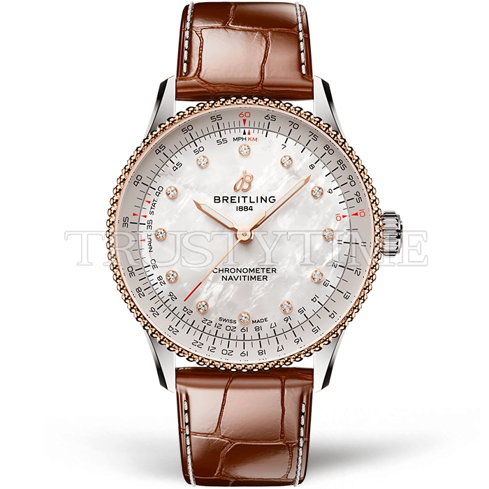 Часы Breitling из коллекции Navitimer. Классические женские часы Breitling Navitimer Automatic 36 U17327211A1P1 премиального качества (Артикул магазина: BT-1117) оснащены надежным автоматическим механизмом с автоподзаводом (работает от амплитуды движения руки) калибра ETA2836-2, в котором реализованы следующие функции: часовая, минутная и секундная стрелки, а так же максимально простой функционал без усложнений. Круглый корпус часов стального цвета, имеющий размер 36 мм и высоту 11.5 мм превосходно дополнит образ и украсит запястье своего обладателя. Для изготовления часов Breitling Navitimer Automatic 36 U17327211A1P1 предлагаемых в нашем интернет-магазине, применяются нержавеющая сталь 316L высокого качества (Швейцарский стандарт), а так же сапфировое стекло высокой прочности, благодаря чему обеспечивается максимальная защита от сколов и механических повреждений. Отличительной чертой данной модели является перламутровый циферблат, часовые индексы которого обеспечивают камни. Завершает образ кожаный ремешок коричневого цвета с фирменной раскладывающейся застежкой Breitling. Водонепроницаемость данной модели составляет 30М (WR30) – допускается минимальное воздействие с водой.