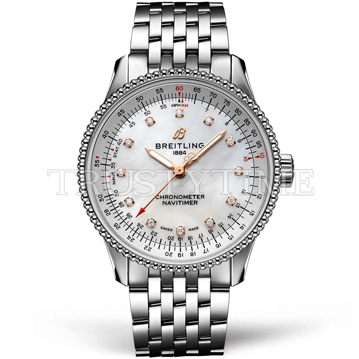 Часы Breitling из коллекции Navitimer. Классические женские часы Breitling Navitimer Automatic 35 A17395211A1A1 премиального качества (Артикул магазина: BT-1133) оснащены надежным автоматическим механизмом с автоподзаводом (работает от амплитуды движения руки) калибра Sellita SW200, в котором реализованы следующие функции: часовая, минутная и секундная стрелки, а так же максимально простой функционал без усложнений. Круглый корпус часов стального цвета, имеющий размер 35 мм и высоту 10 мм превосходно дополнит образ и украсит запястье своего обладателя. Для изготовления часов Breitling Navitimer Automatic 35 A17395211A1A1 предлагаемых в нашем интернет-магазине, применяются нержавеющая сталь 316L высокого качества (Швейцарский стандарт), а так же сапфировое стекло высокой прочности, благодаря чему обеспечивается максимальная защита от сколов и механических повреждений. Отличительной чертой данной модели является перламутровый циферблат, часовые индексы которого обеспечивают камни. Завершает образ браслет из нержавеющей стали стального цвета с фирменной раскладывающейся застежкой Breitling. Водонепроницаемость данной модели составляет 30М (WR30) – допускается минимальное воздействие с водой.
